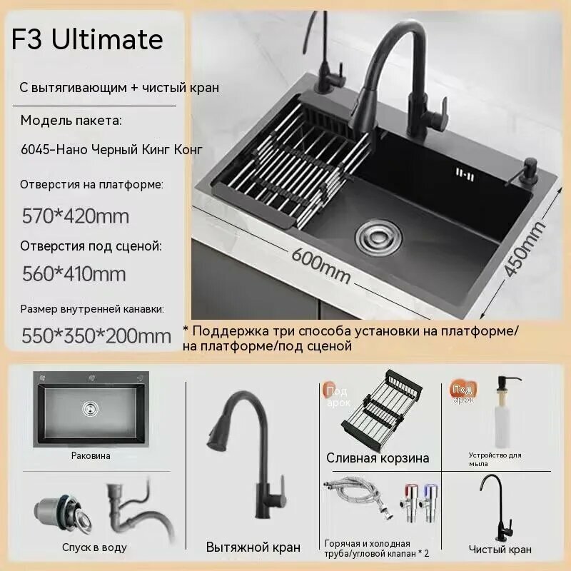 Кухонная мойка из нержавеющей стали, 60×45 см, /Sinks-one/черный комплект С выдвижным краном: сравнение цен, характеристики, фото, актуальное наличие и цены.