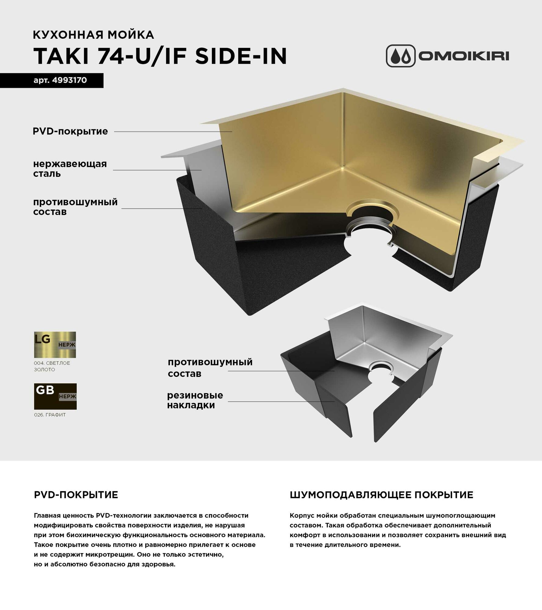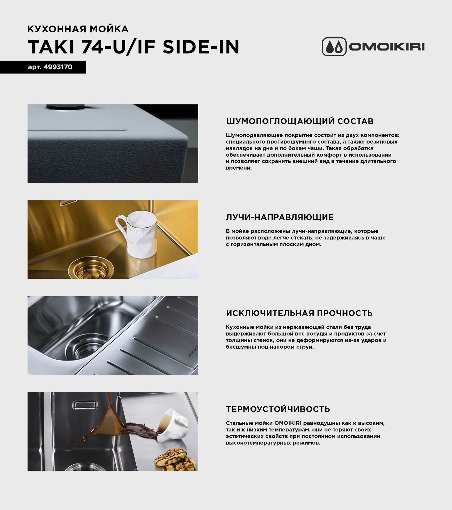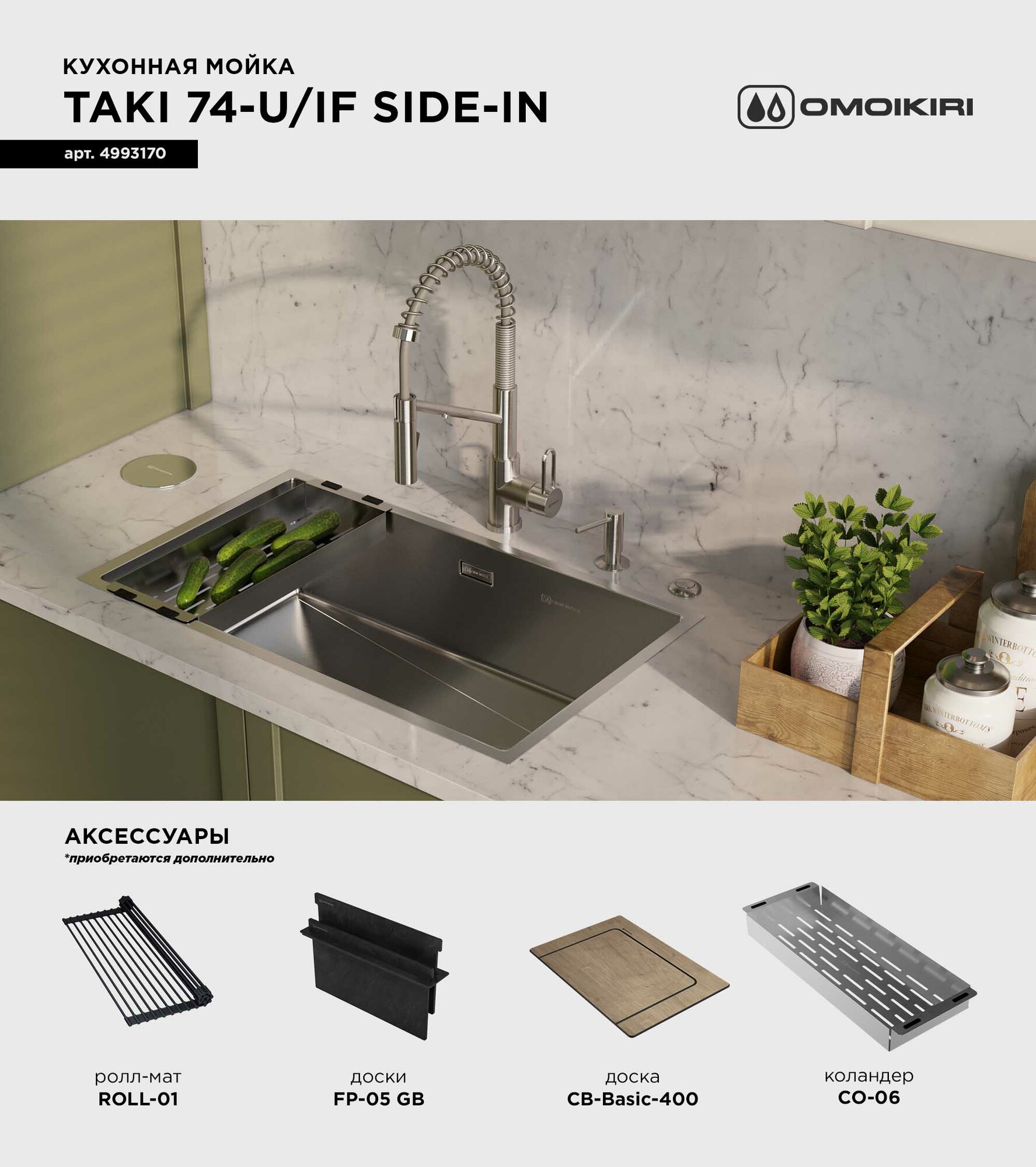 Мойка из нержавеющей стали OMOIKIRI Taki 74-U/IF Side с вместительной чашей - это желанный помощник для многих. С такой мойкой можно забыть про нехватку места, она настолько вместительная, что можно одновременно размораживать мясо или рыбу, мыть овощи или фрукты, замочить противень или кастрюлю, вымыть тарелки.