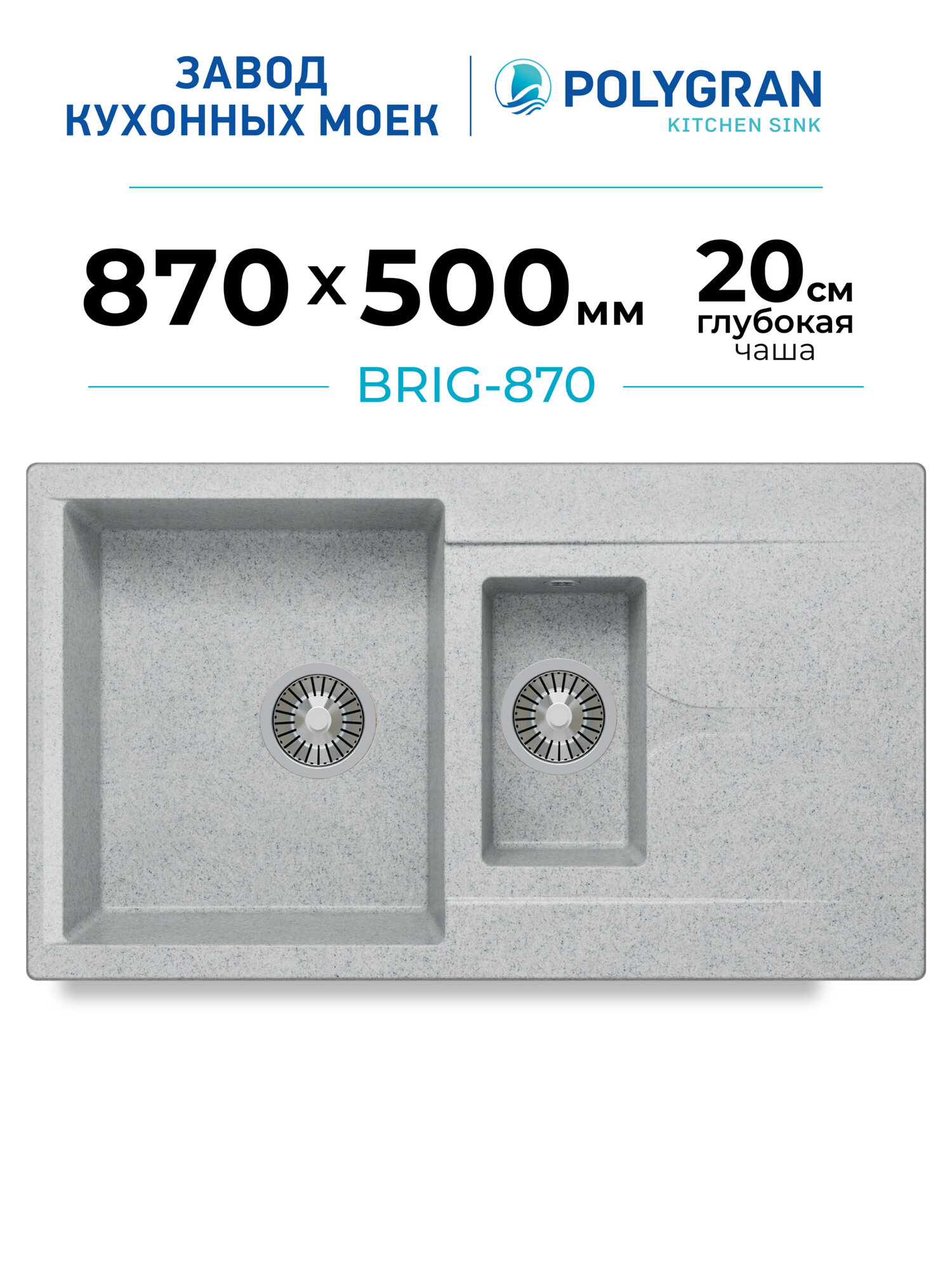 Купить Мойка для кухни каменная POLYGRAN BRIG-870, Серая, Врезная, Квадратная, С крылом, 2 чаши (Светло-серый №314) с доставкой по всей России.