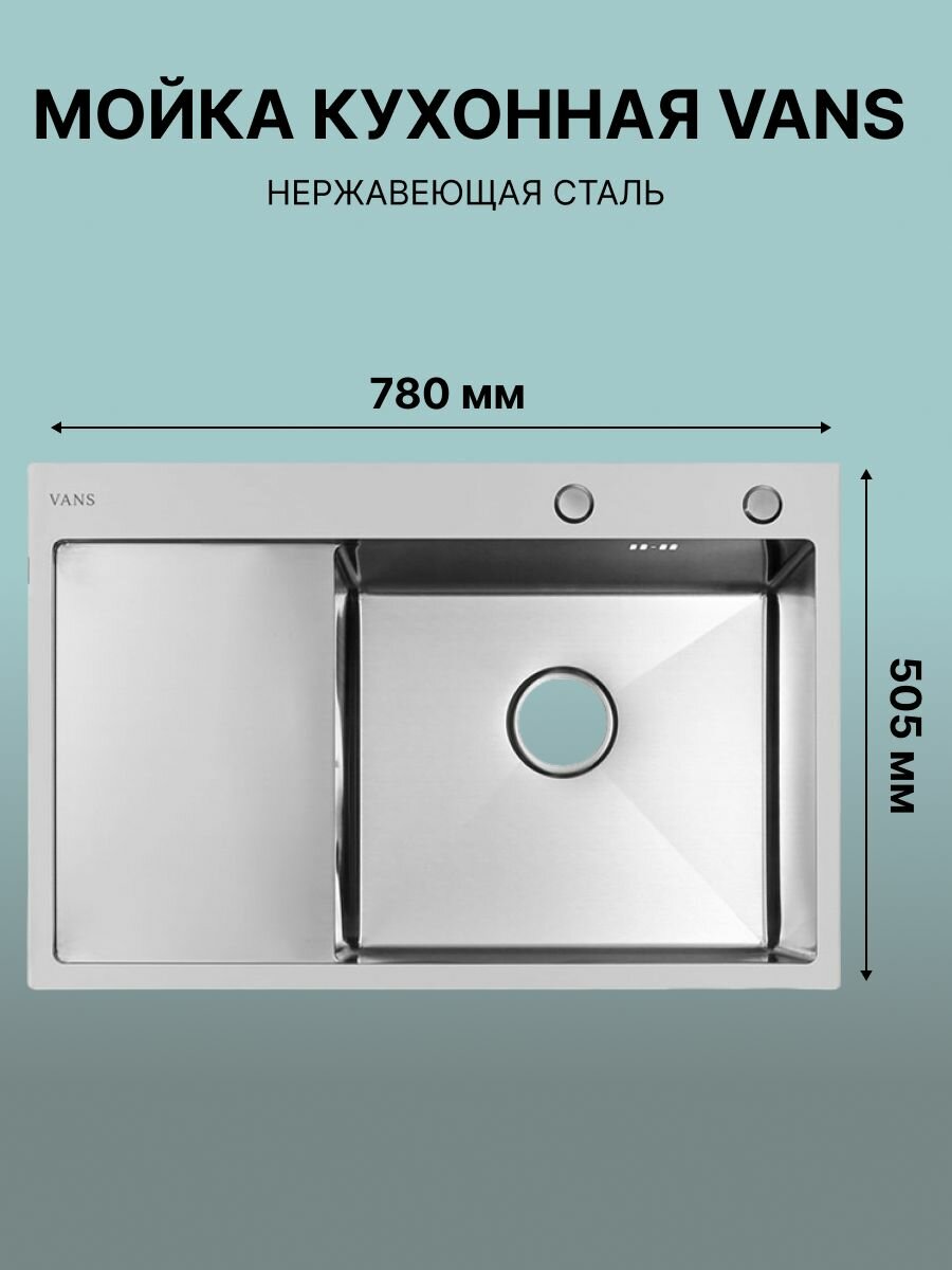 Кухонные мойки VANS, высокого качества, которое достигается за счет пищевой нержавеющей стали марки AISI304, разработанной по европейским стандартам качества, что позволяет быть продукту экологически чистым. Преимуществом данной кухонной мойки является толщ. металла чаши мойки 1мм. а верхняя часть 3мм. Данная конструкция позволяет установить мойку, как на столешницу, так и под нее. Мойки VANS по всему корпусу имеет шумопоглащающую обливку, что позволяет ей быть практически бесшумной. В комплектацию кухонной мойки входит дозатор в цвет мойки и высокотехнологичный сифон с отсеком для мусора. Раковина мойка для кухни – это важный предмет в вашей кухне. Раковина накладная для кухни проста в установке и эксплуатации. В комплекте с мойкой идет дозатор и сливная арматура.