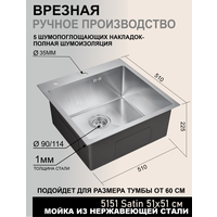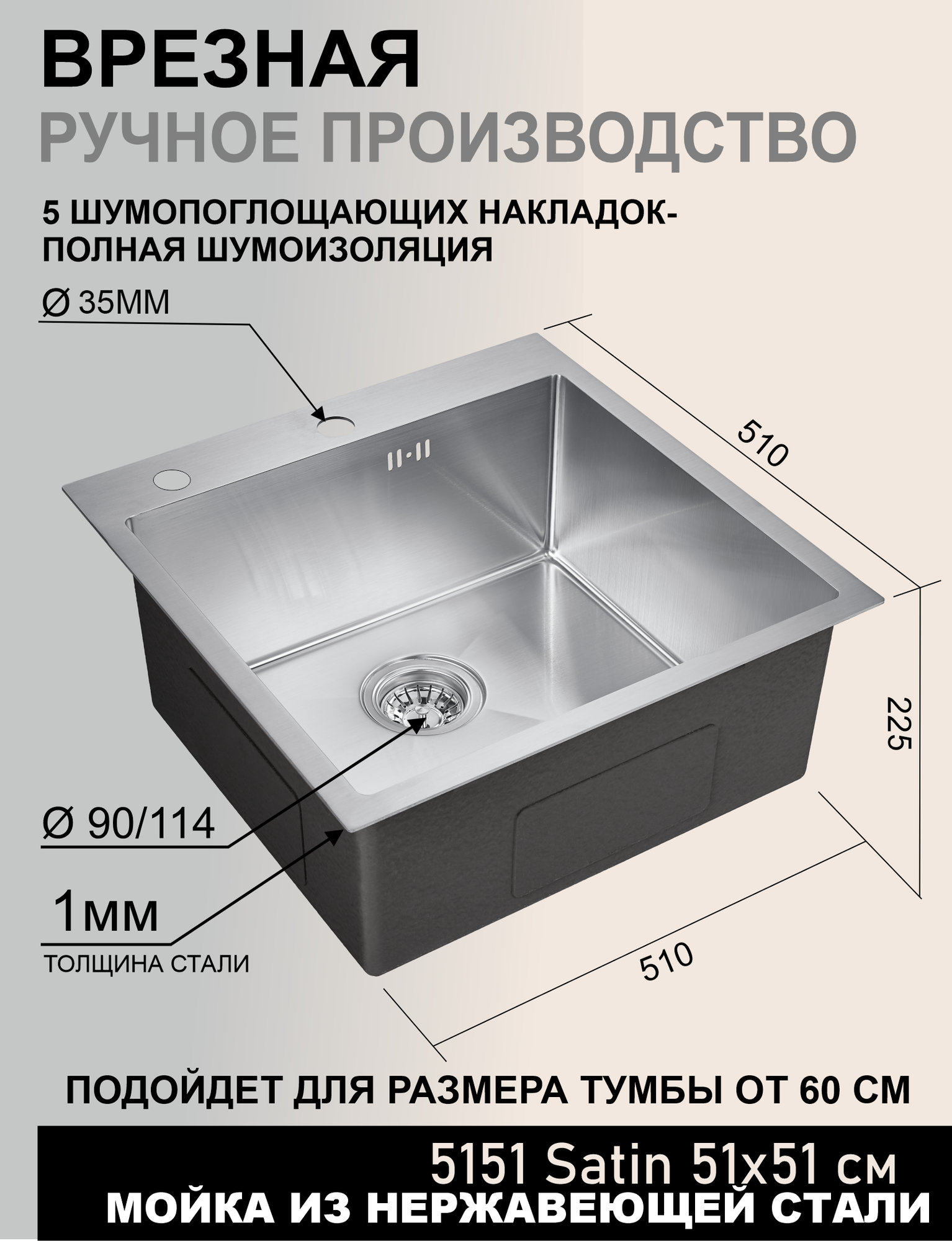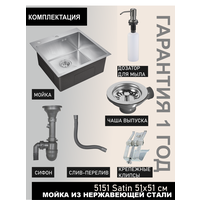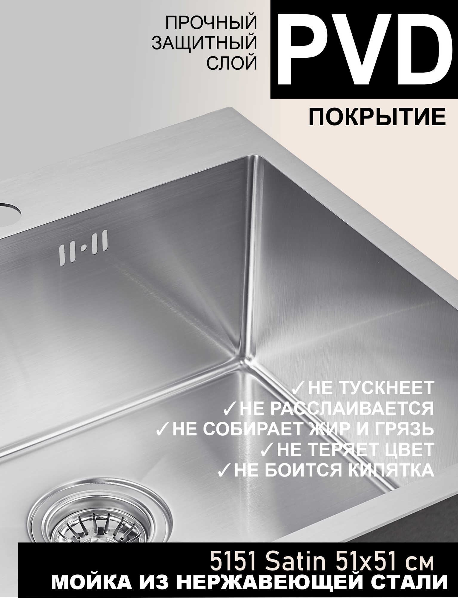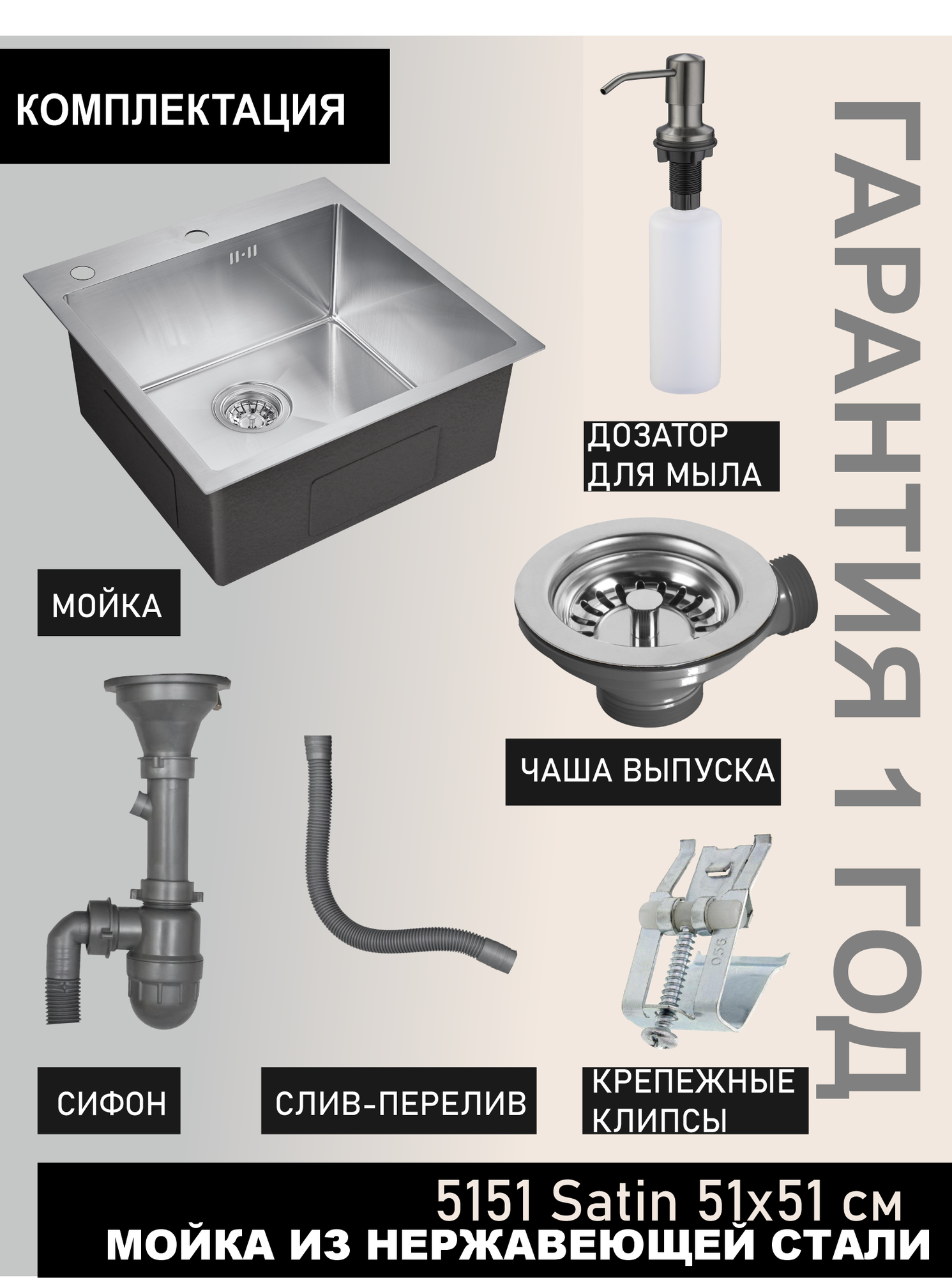 Мойка для кухни 5151 Satin 50х50 см сатин с дозатором, нержавеющая сталь, PVD-покрытие, квадратная: сравнение цен, характеристики, фото, актуальное наличие и цены.