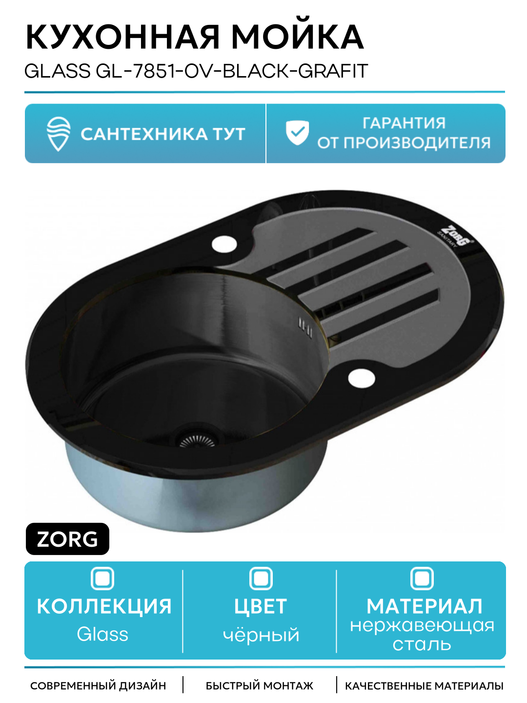 Кухонная мойка ZorG Glass GL-7851-OV-BLACK-GRAFIT Черный / Графит нержавеющая сталь встраиваемый 78: сравнение цен, характеристики, фото, актуальное наличие и цены.