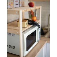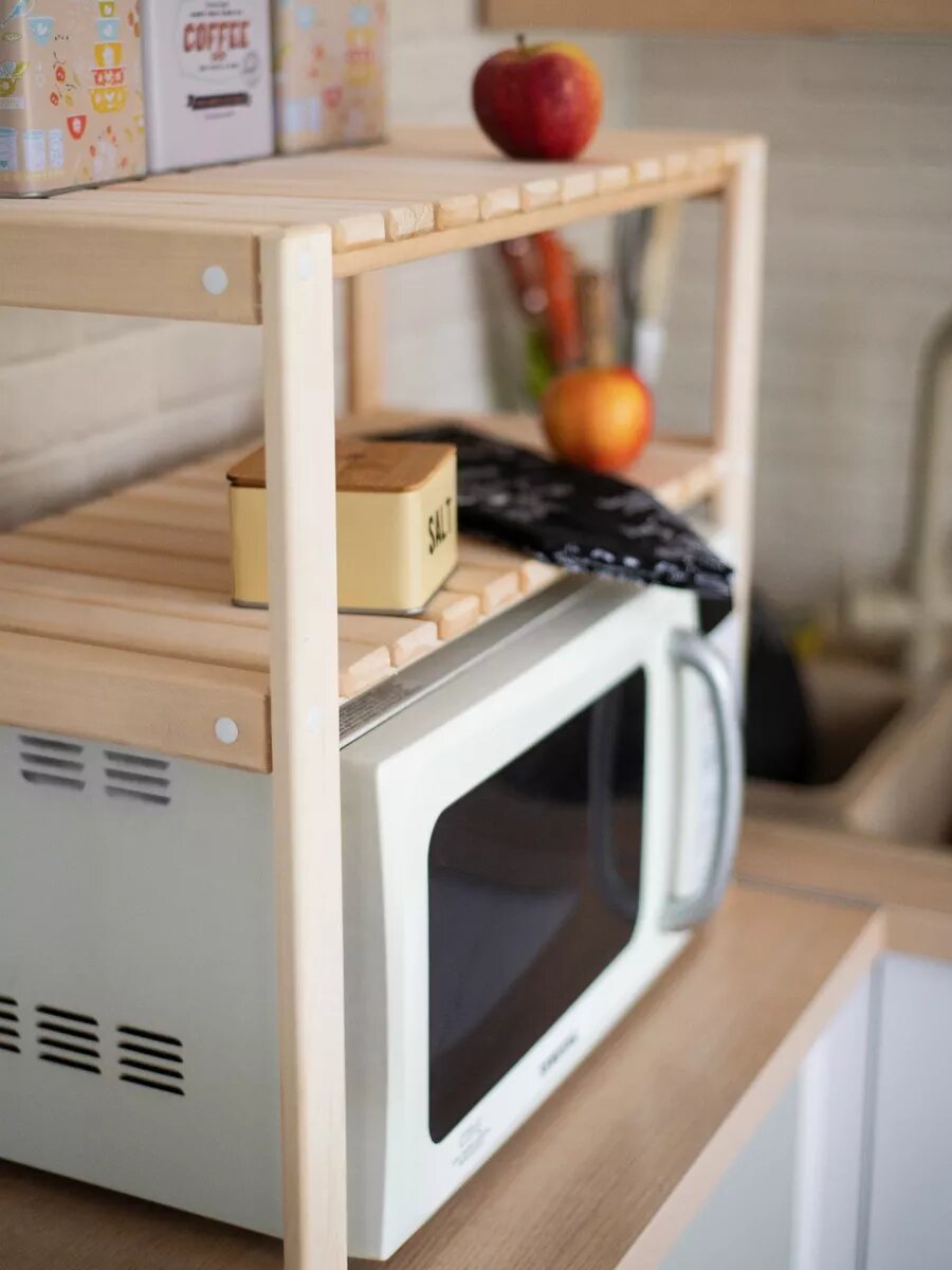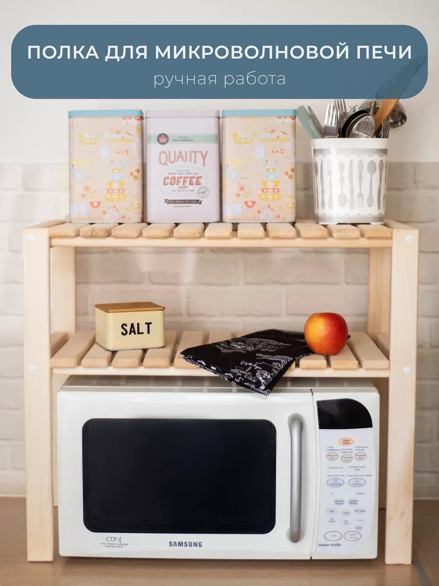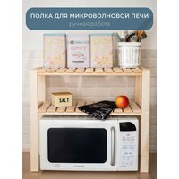 Многофункциональная деревянная полка для кухни без лакокрасочного покрытия идеальна для хранения и организации вашего пространства. Полка под микроволновую печь предназначена специально для микроволновки, но может также использоваться как стойка или стеллаж для различных предметов в вашей кухне. Полка настольная для микроволновки станет прекрасным вариантом
