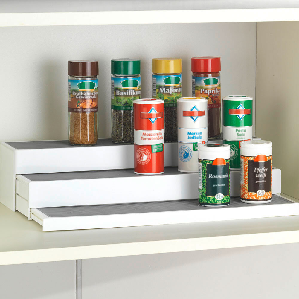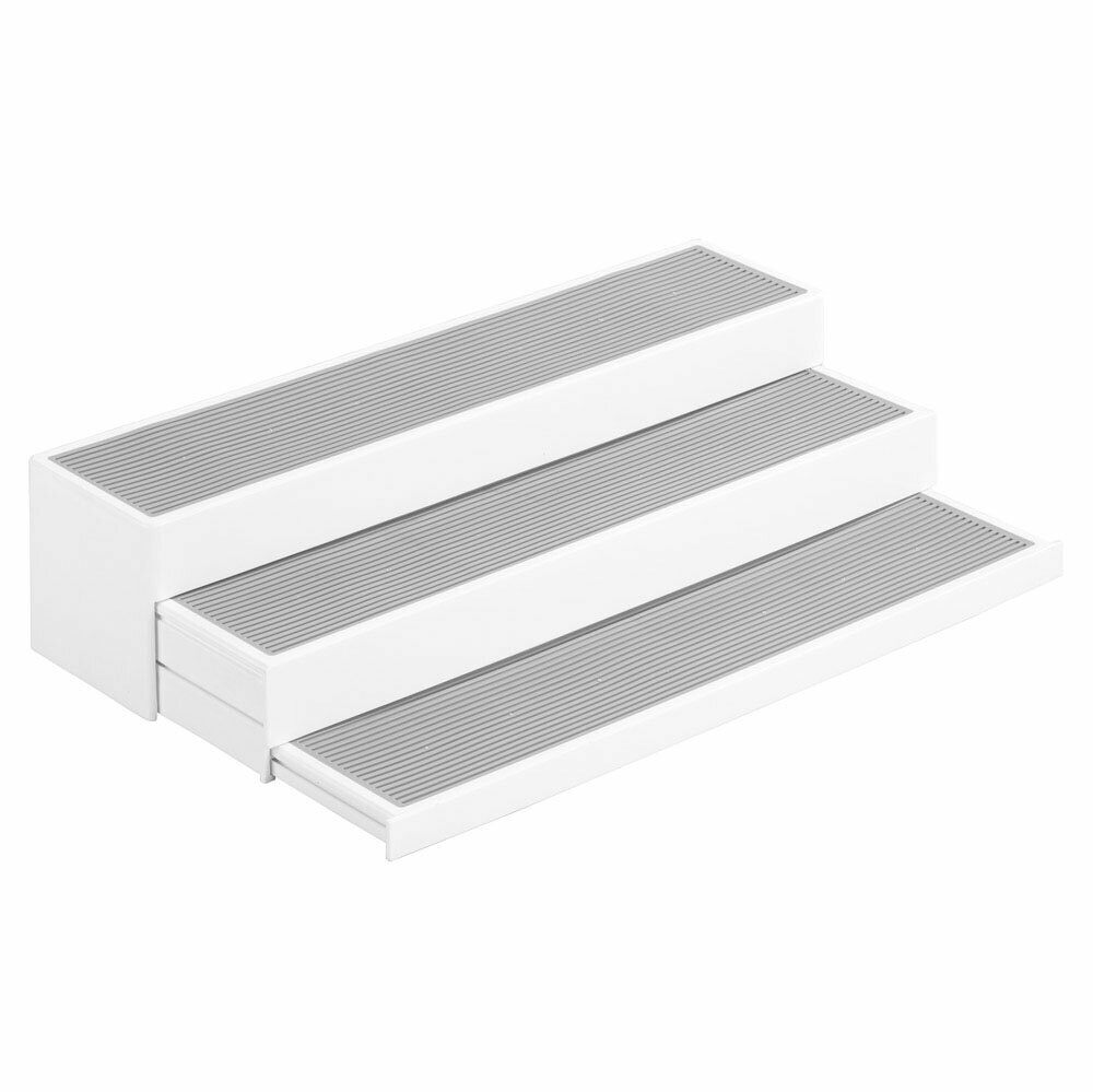 Практичная полочка с 3-мя ступеньками. С ее помощью вы легко найдете необходимое в кухонном шкафу: специи, чай, лекарство или иное. Полочка раздвигается в 3 ступени. Поверхности покрыты нескользким материалом. Материал: полипропилен и ТПЕ. Размеры: 37 х 8,5 - 23 х 8,5 см.