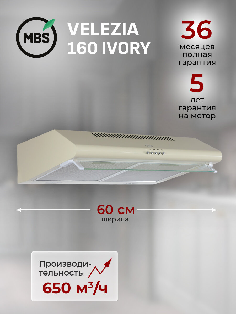 Купить Кухонная вытяжка подвесная MBS VELEZIA 160 IVORY/60 см/производительность 650м3/ч, низкий уровень шума. с доставкой по всей России. Кухонная вытяжка подвесная MBS VELEZIA 160 IVORY/60 см/производительность 650м3/ч, низкий уровень шума.: сравнение цен, характеристики, фото, актуальное наличие и цены.