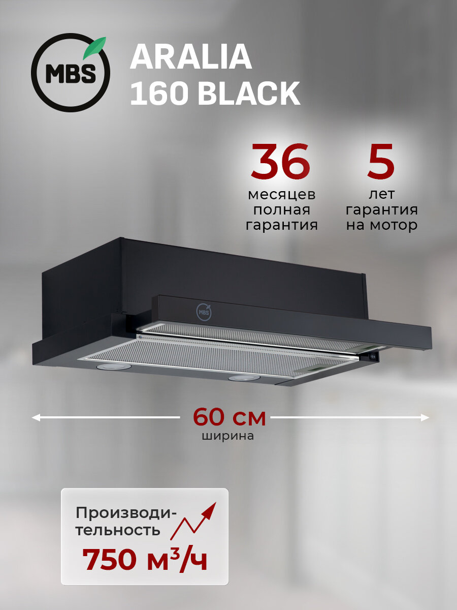 Купить Кухонная вытяжка встраиваемая MBS ARALIA 160 BLACK/60 см/производительность 750м3/ч, низкий уровень шума. с доставкой по всей России. Кухонная вытяжка встраиваемая MBS ARALIA 160 BLACK/60 см/производительность 750м3/ч, низкий уровень шума.: сравнение цен, характеристики, фото, актуальное наличие и цены.