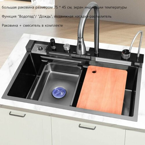 Это новая встраиваемая многофункциональная кухонная мойка с выдвижным краном, водопадом и индикатором температуры, смесителем, мойкой для чашек, дозатором мыла и автоматическим регулятором слива.