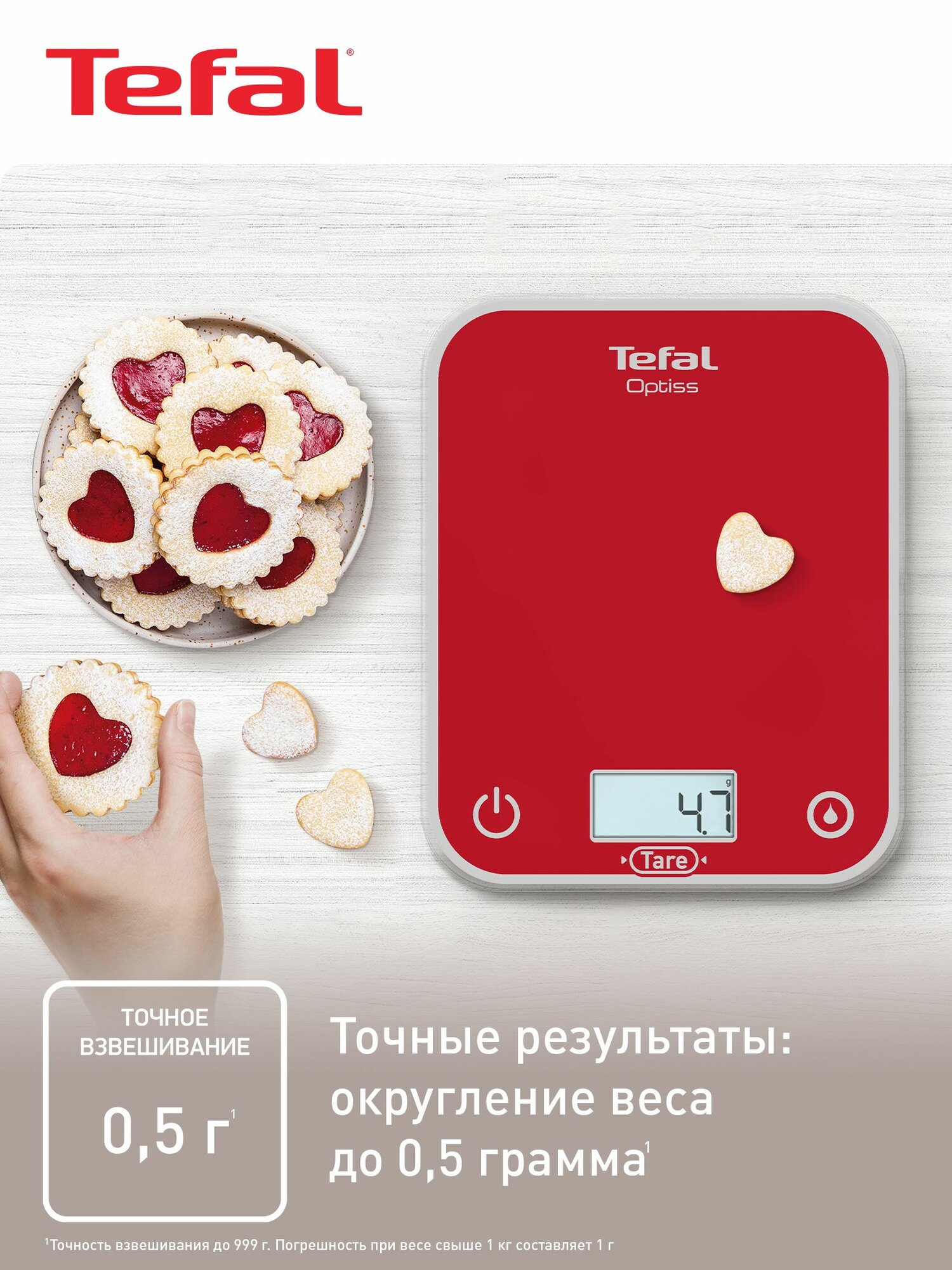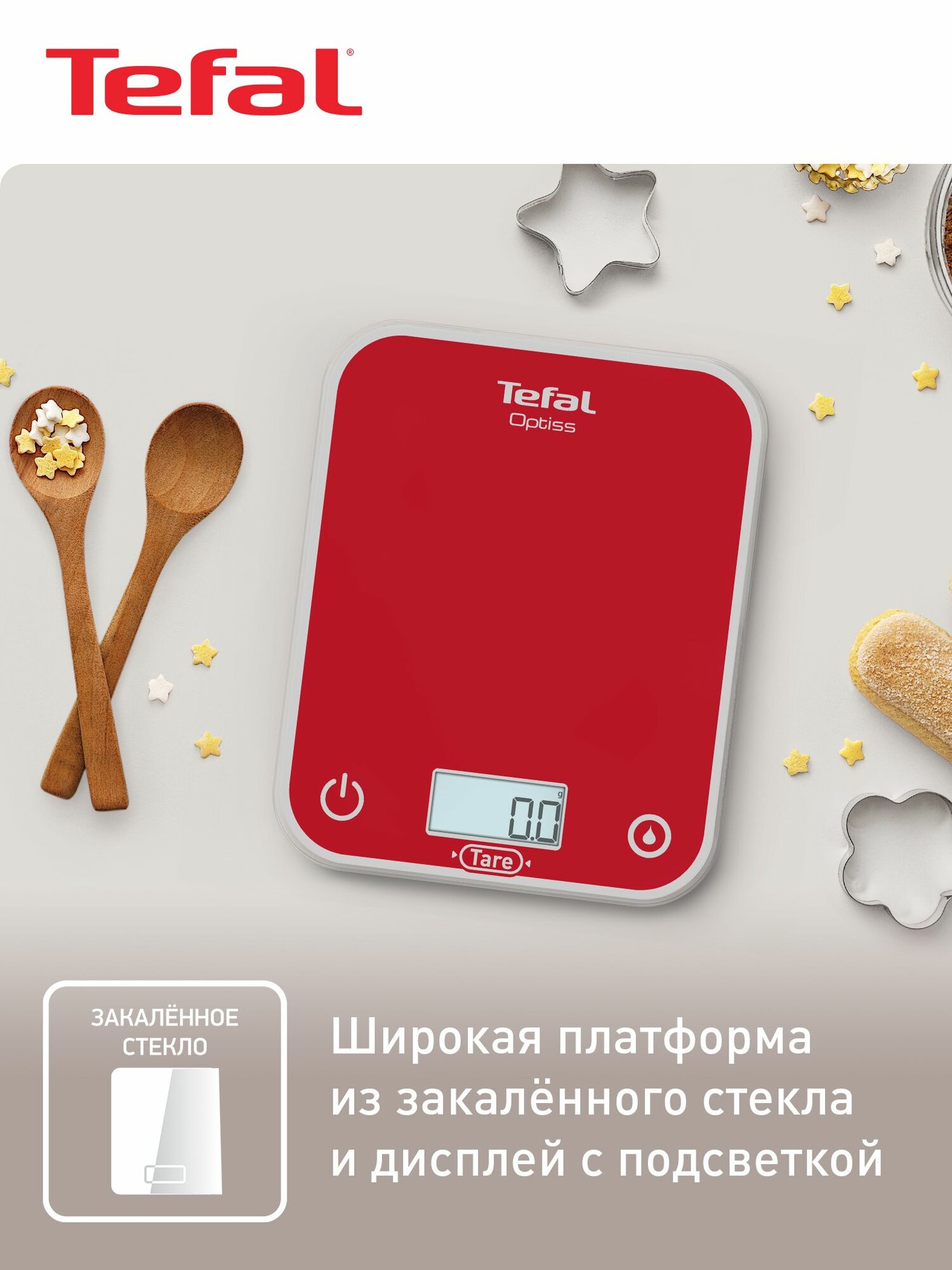 Кухонные весы Tefal Optiss BC50U3V0. Кухонные весы Optiss станут идеальным гаджетом для всех любителей выпечки. Весы оснащены крупным наглядным дисплеем с подсветкой и множеством интеллектуальных функций, облегчающих приготовление выпечки по любым рецептам. Прибор позволяет взвешивать ингредиенты до 5 кг с точностью до 0,5 г, а удобная функция учета тары позволяет взвешивать все ингредиенты в одной емкости. Весы подходят для взвешивания как сухих, так и жидких ингредиентов, а также позволяют выбирать между имперскими и метрическими единицами измерения. Благодаря стильному дизайну и тонкому корпусу для весов найдется место на любой кухне. Удобно и наглядно Электронные кухонные весы с большим ЖК-дисплеем с подсветкой и крупными цифрами высотой 1,6 см для удобства чтения. Практичная конструкция Платформа кухонных весов изготовлена из прочного, устойчивого к царапинам и простого в очистке закаленного стекла, а ее размер 17,5 x 22,5 см позволяет взвешивать емкости любого размера. Высокий порог Максимальный предел взвешивания в 5 кг позволяет готовить большие количества блюд и выпечки по самым разным рецептам, включая печенье, блинчики, домашнее тесто для пиццы, хлеб и многое другое. Для идеального результата Кухонные весы обеспечивают точность взвешивания до 0,5 г (до 999 г) и 1 г (свыше 1 кг). Функция "Тара" Экономьте время при взвешивании благодаря функции "Тара", которая позволяет обнулять вес после добавления каждого нового ингредиента. Никаких ошибок Весы позволяют легко переключаться между взвешиванием сухих и жидких ингредиентов как в метрической (г, мл), так и в имперской (жидкие унции, фунты, унции) мерах измерения. Готовы к использованию В комплект входят 2 батарейки ААА, которые позволяют использовать весы сразу после покупки. Легко хранить Тонкий корпус и выдвижной крючок позволяют удобно хранить весы в перерывах между использованиями.