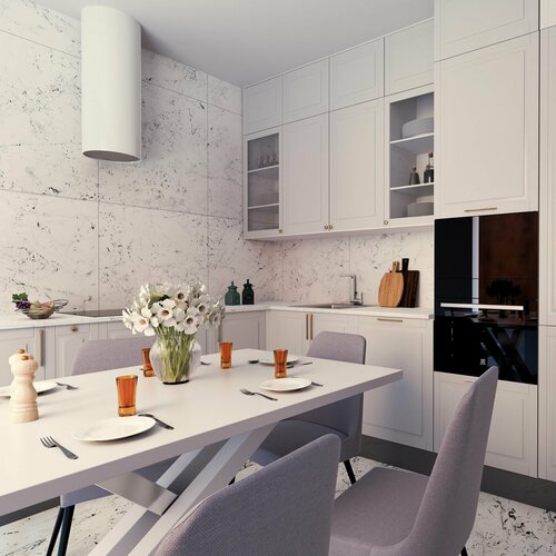 Кухонный фартук на стену "Скиф" применяется для облицовки стен кухонь. Изготовлена из ДСП — прочного и влагостойкого материала, полученного в процессе прессования деревянной стружки. Панель из ДСП — это дешевая и практичная замена классическому плиточному фартуку. Изделие крепится на задней части столешницы. Панель имеет матовое структурное покрытие, устойчивое к повреждениям. Еще недавно расстояние между верхними шкафами и рабочей поверхностью стола на кухне выкладывалось кафельной плиткой. Облицовка кафелем трудоемка, требует профессиональных навыков и больших денежных затрат. Сегодня все европейские фабрики по изготовлению кухонь рекомендуют своим потребителям для улучшения дизайна закрывать это расстояние мебельным щитом или так называемой кухонной панелью. Кухонный фартук на стену, идеально подходит под цвет столешницы