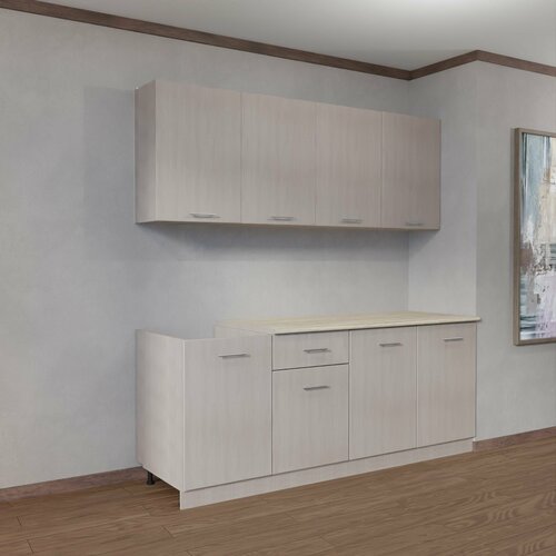 Кухонный гарнитур "Алеся". 2 метра. Материал: ЛДСП 16мм. Фурнитура: петли накладные, ручки-рейлинги металлические. Направляющие: шариковые. Опоры: 10см Столешница: 26мм (для стола под мойку столешница не входит) Не входит в комплект: мойка, посудосушитель. В стол под мойку нужна накладная мойка размером 500*600мм Количество упаковок - 12 шт (Двенадцать).