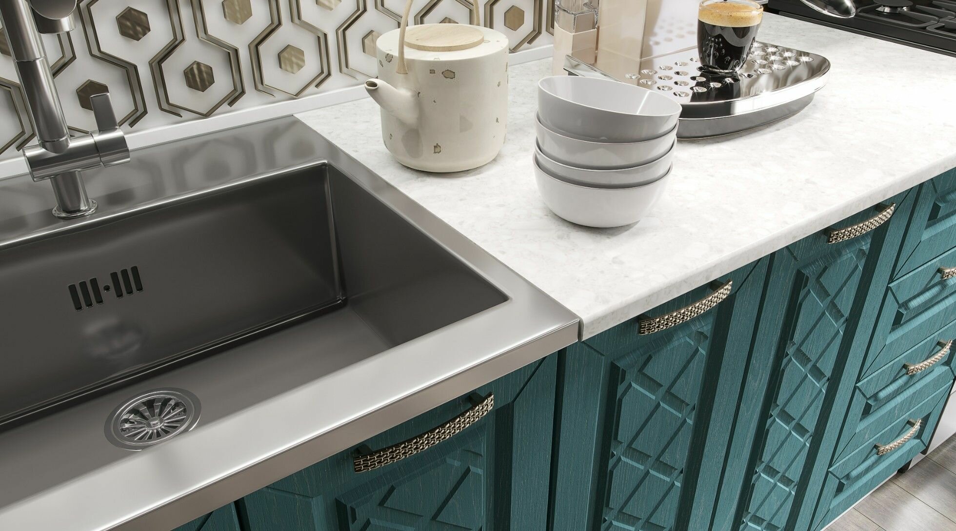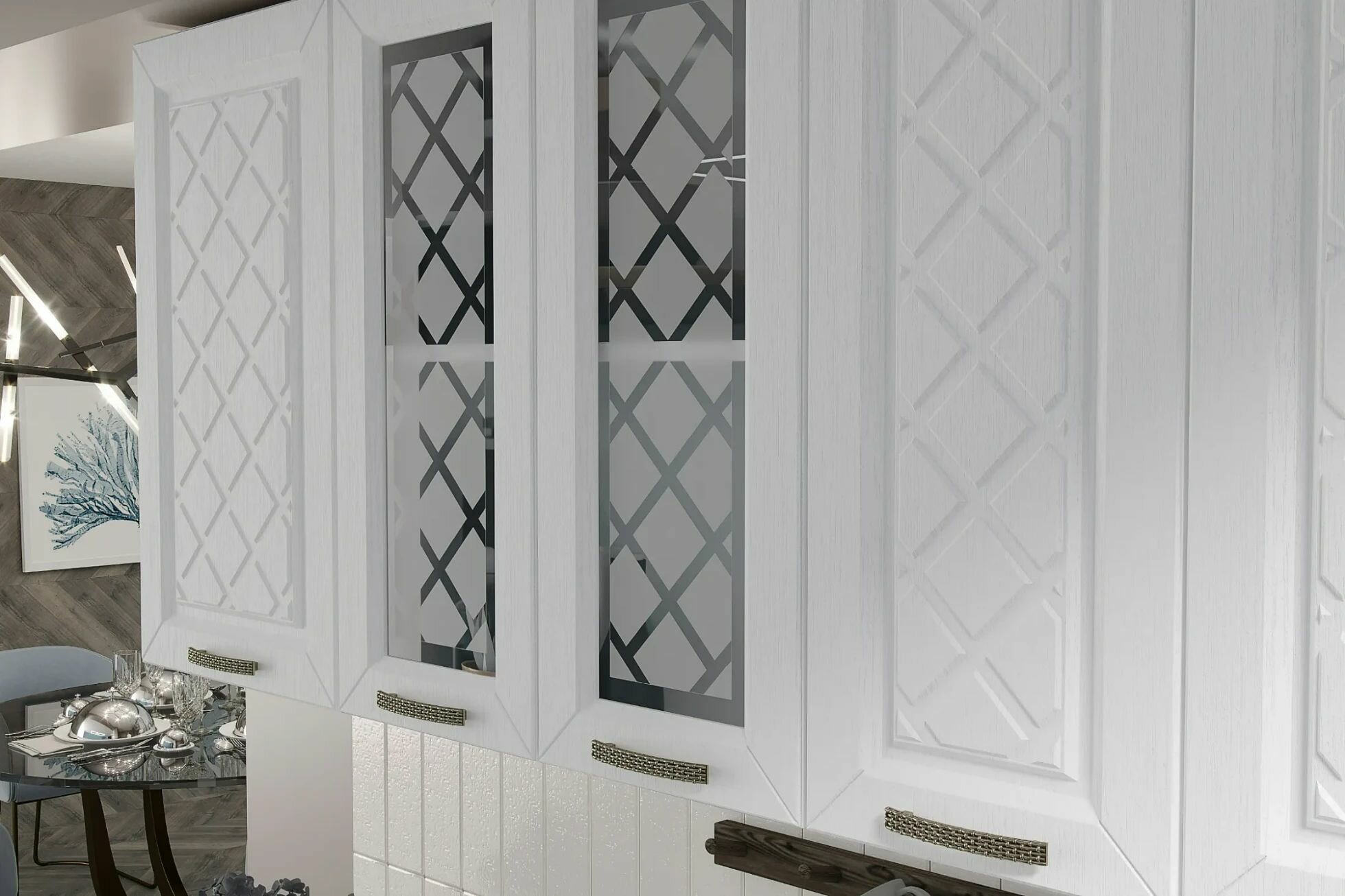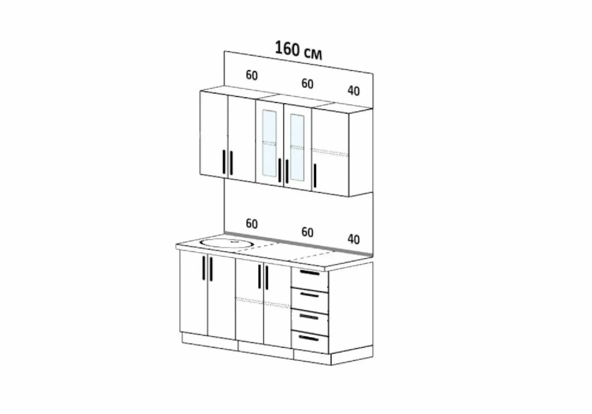 настенный шкаф с одной дверцей, настенный шкаф со стеклянными вставками, настенный шкаф с двумя дверцами, шкаф напольный с ящиками и дверцами, шкаф напольный под мойку