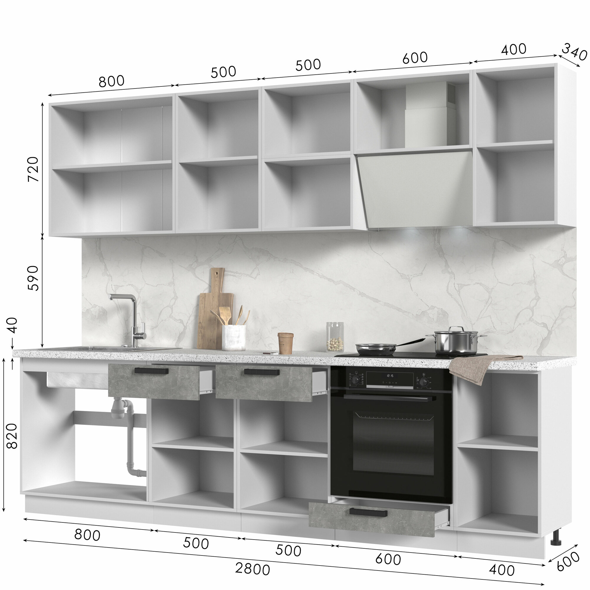 | Подробная комплектация | Верхние модули: ШВ400, ШВ600, ШВ800, Нижние модули: ШНМ600, ШН1Я800, ШН400 |