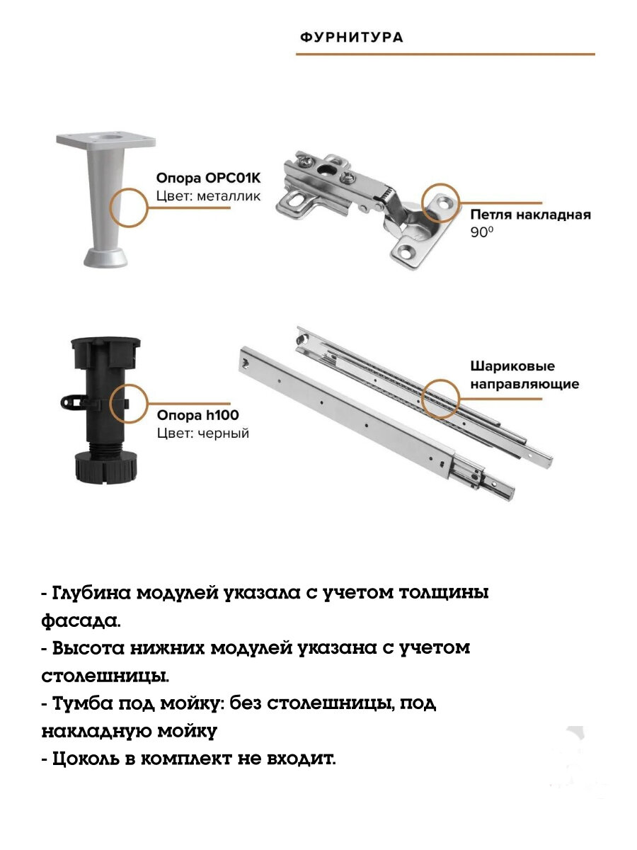 Стеновая панель (фартук), мойка, цоколь, карниз, подсветка, бытовая техника в стоимость кухонного гарнитура не входят и приобретаются дополнительно.