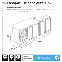 Низ (ШхГхВ): М600 60х44.6х81 см - 1 шт Н600 60х44.6х84 см - 1 шт Н400-4я 40х44.6х84 см - 1 шт. Дополнительно: Высота нижних модулей указана с учетом столешницы, кроме модуля М600 под мойку. Глубина верхних и нижних шкафов указана с учетом фасада. Модуль под мойку невозможно установить при сборке по центру без распила цельной столешницы.