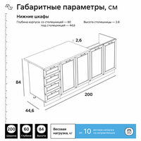Низ (ШхГхВ): М600 60х44.6х81 см - 1 шт Н600 60х44.6х84 см - 1 шт Н400-4я 40х44.6х84 см - 1 шт. Дополнительно: Высота нижних модулей указана с учетом столешницы, кроме модуля М600 под мойку. Глубина верхних и нижних шкафов указана с учетом фасада. Модуль под мойку невозможно установить при сборке по центру без распила цельной столешницы.