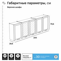 Гарнитур включает в себя верхние и нижние шкафы, а также столешницу. Верхние шкафы имеют размеры 40х29х70.6 см, 60х29х70.6 см и 80х29х70.6 см, а нижние шкафы - 40х44.6х84 см, 60х44.6х84 см и 100х60х80.6 см.