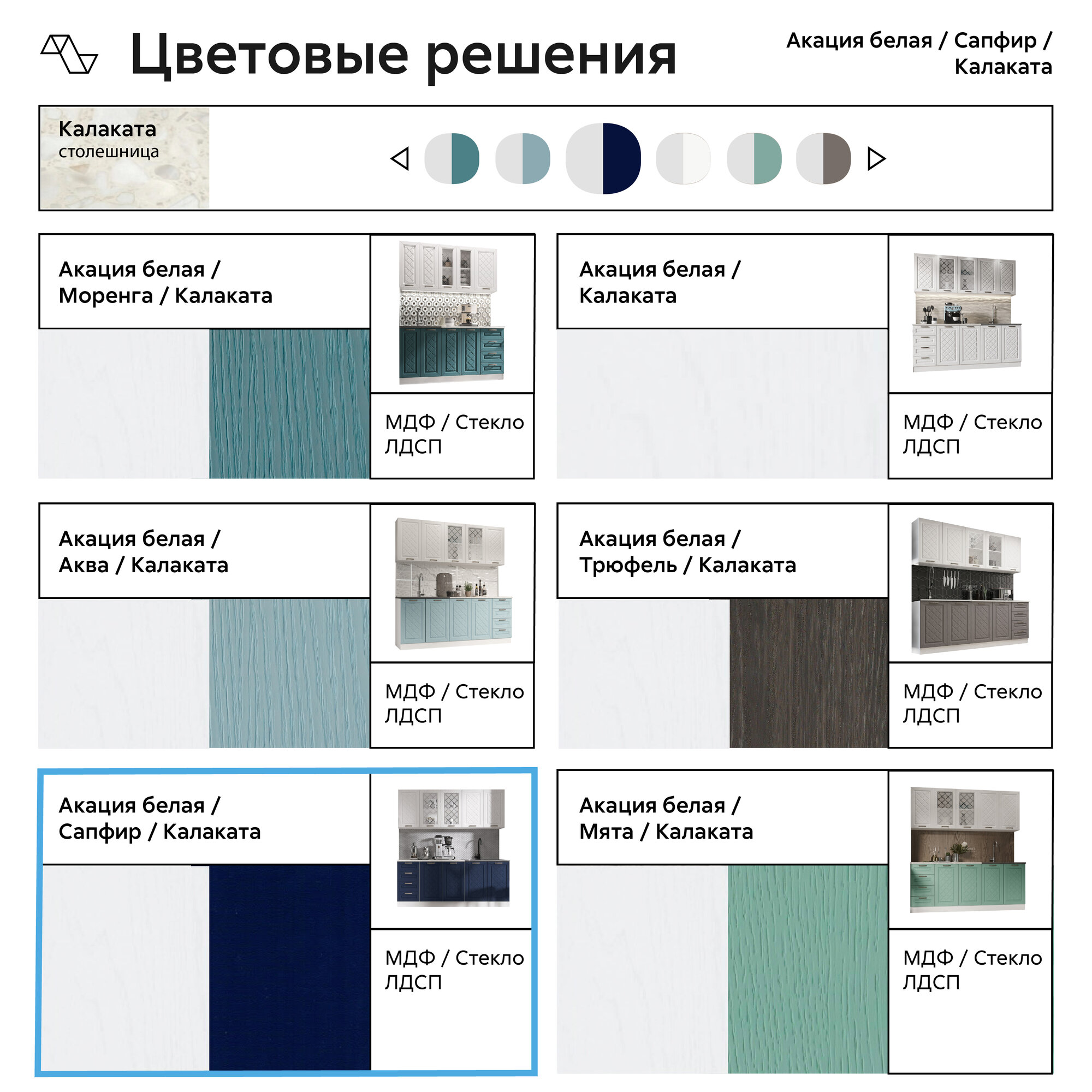 Кухонный гарнитур Агава - это современное и функциональное решение для вашей кухни. Он выполнен в стильном сочетании цветов Акация белая и Сапфир, что позволит ему гармонично вписаться в интерьер любого стиля, и сочетаться с кухонными стульями, обеденными столами другой мебелью.