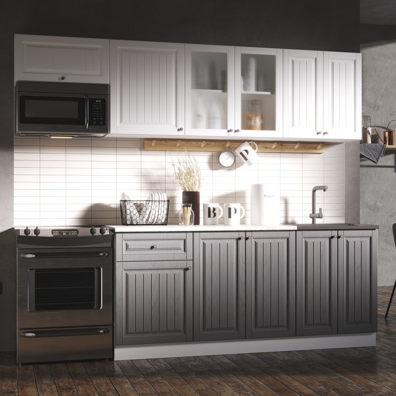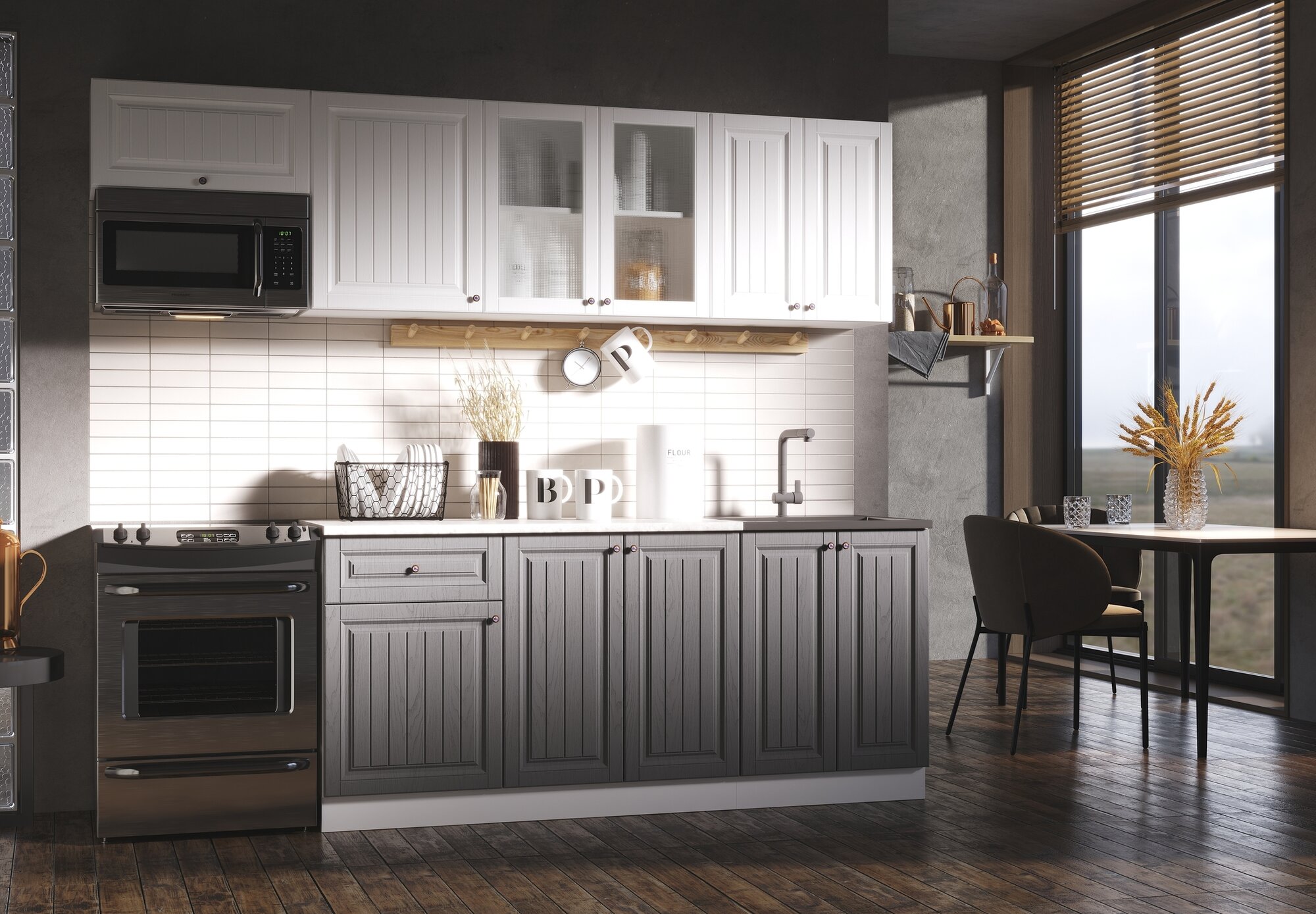 Кухонный гарнитур, готовый комплект Хозяюшка 2.4 метра Акация белая/Трюфель: сравнение цен, характеристики, фото, актуальное наличие и цены.