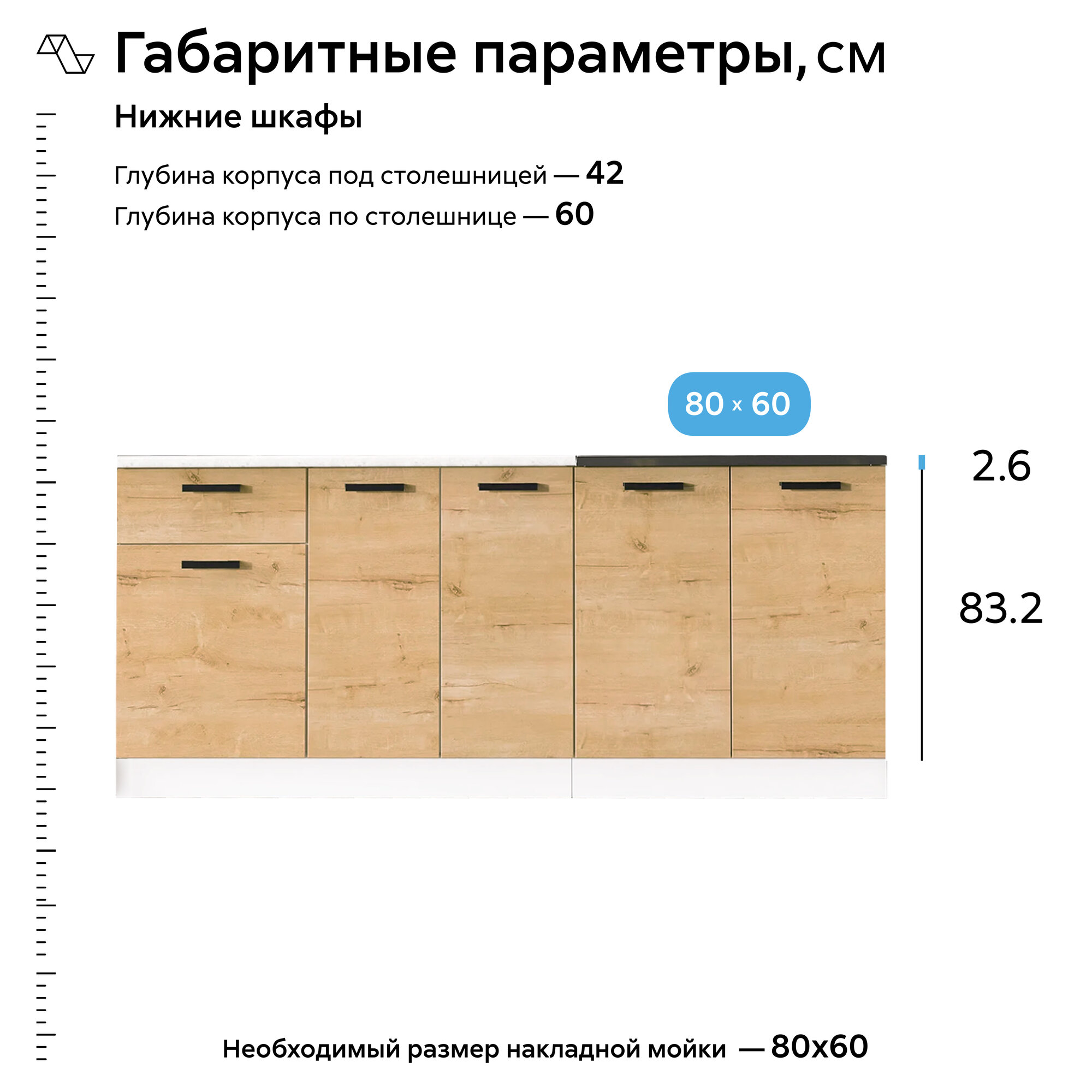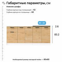 Глубина верхних шкафов- 29 см; Глубина нижних шкафов- 42 см; Высота верхних шкафов- 62.6 см; Высота нижних шкафов-83.1 см; Глубина корпуса под столешницей- 42 см; Глубина по столешнице- 60 см; Высота нижних шкафов указана с учетом столешницы. Глубина верхних и нижних шкафов указана с учетом фасада.