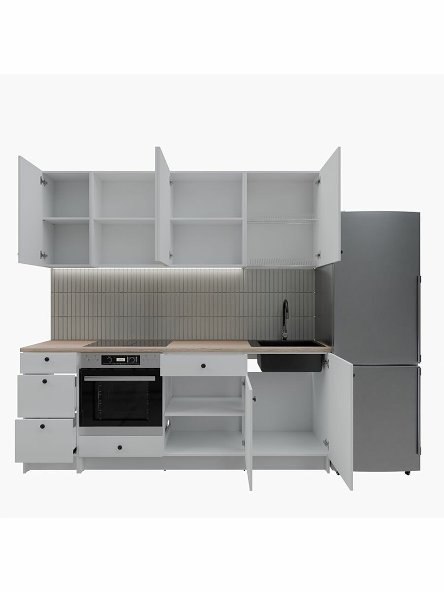 Распашной шкаф с одной полкой 60х75х31 см - 1 шт; Распашной шкаф с посудосушителем 60х75-31 см - 1 шт; Распашной шкаф с одной полкой 40х75х31 см - 1 шт; Напольный шкаф с 3 выдвижными ящиками 40х91х61 см - 1 шт; Напольный модуль с ящиком и двумя дверьми 120х91х61 см - 1 шт; Подиум для духового шкафа - комплект 2 шт.