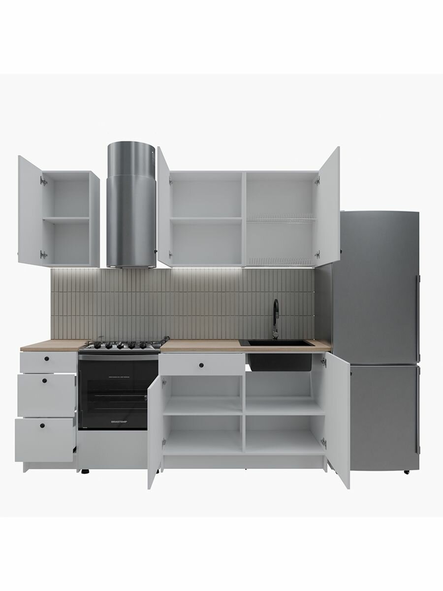 Распашной шкаф с одной полкой 60х75х31 см - 1 шт; Распашной шкаф с посудосушителем 60х75-31 см - 1 шт; Распашной шкаф с одной полкой 40х75х31 см - 1 шт; Напольный шкаф с 3 выдвижными ящиками 40х91х61 см - 1 шт; Напольный модуль с ящиком и двумя дверьми 120х91х61 см - 1 шт; Подиум для духового шкафа - комплект 2 шт.