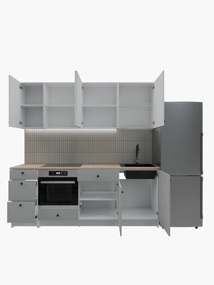 Распашной шкаф с одной полкой 60х75х31 см - 1 шт; Распашной шкаф с посудосушителем 60х75-31 см - 1 шт; Распашной шкаф с одной полкой 40х75х31 см - 1 шт; Напольный шкаф с 3 выдвижными ящиками 40х91х61 см - 1 шт; Напольный модуль с ящиком и двумя дверьми 120х91х61 см - 1 шт; Подиум для духового шкафа - комплект 2 шт.