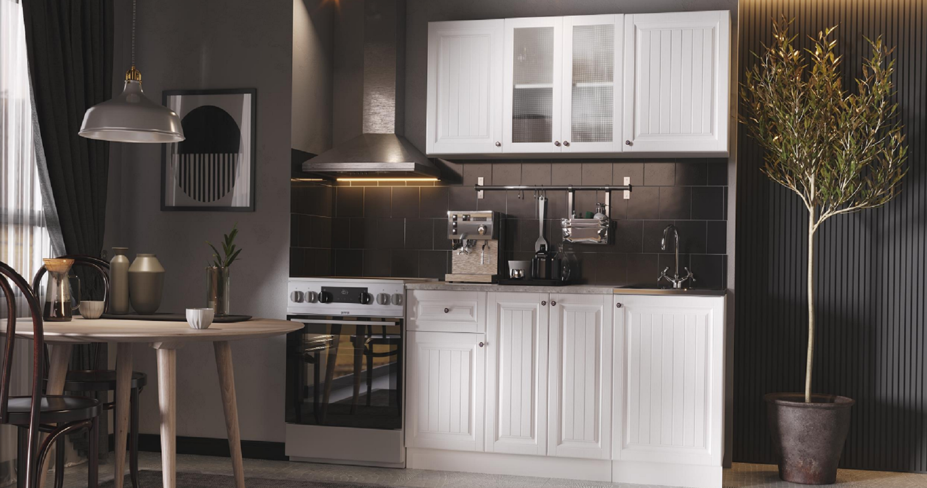 Столешница: Цельная (1000мм), Толщина 26 мм; Верх (ВхШхГ): Шкаф 1 дверь + 2 двери со стеклом: 626 х 1000 х 290 мм. Шкаф 1 дверь: 626 х 500 х 290 мм. Низ (ВхШхГ): Стол 3 двери и 1 ящик: 840 х 1000 х 420 мм. Стол под мойку: 840 х 500 х 420 мм.