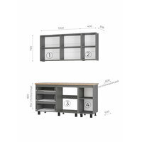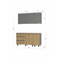 стол под мойку, стол-рабочий: 2 шт., шкаф навесной: 3 шт., столешница, ручки нижних модулей: 4 шт., опоры Н100: 6 шт., опоры Н100: 6 шт., петли створок без доводчиков, роликовые направляющие выдвижных ящиков, навесы шкафов Р-образные