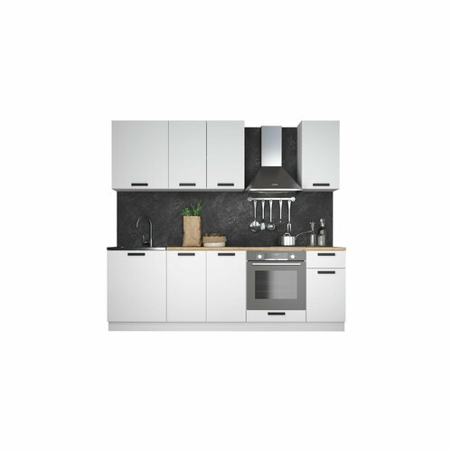 Функциональный готовый комплект модулей подойдет для небольшой кухни в стиле сканди, лофт, экоминимализм. Лаконичные фасады ЛДСП в актуальных декорах природных оттенков в сочетании с классическим белым цветом создают спокойную гармоничную атмосферу, зрительно увеличивают пространство. Широкие черные ручки-скобы с бархатистым покрытием Soft-touch удобны в использовании и придают своеобразный колорит и характер кухне. Верхние шкафы: высота 72 см. В комплекте одна полка. Полка с закрытых торцов без кромки. Модуль под мойку: в комплектацию полка и задняя стенка не входят. При необходимости кухню можно доукомплектовать модулем под вытяжку. Столешница и стеновая панель в комплект не входят.