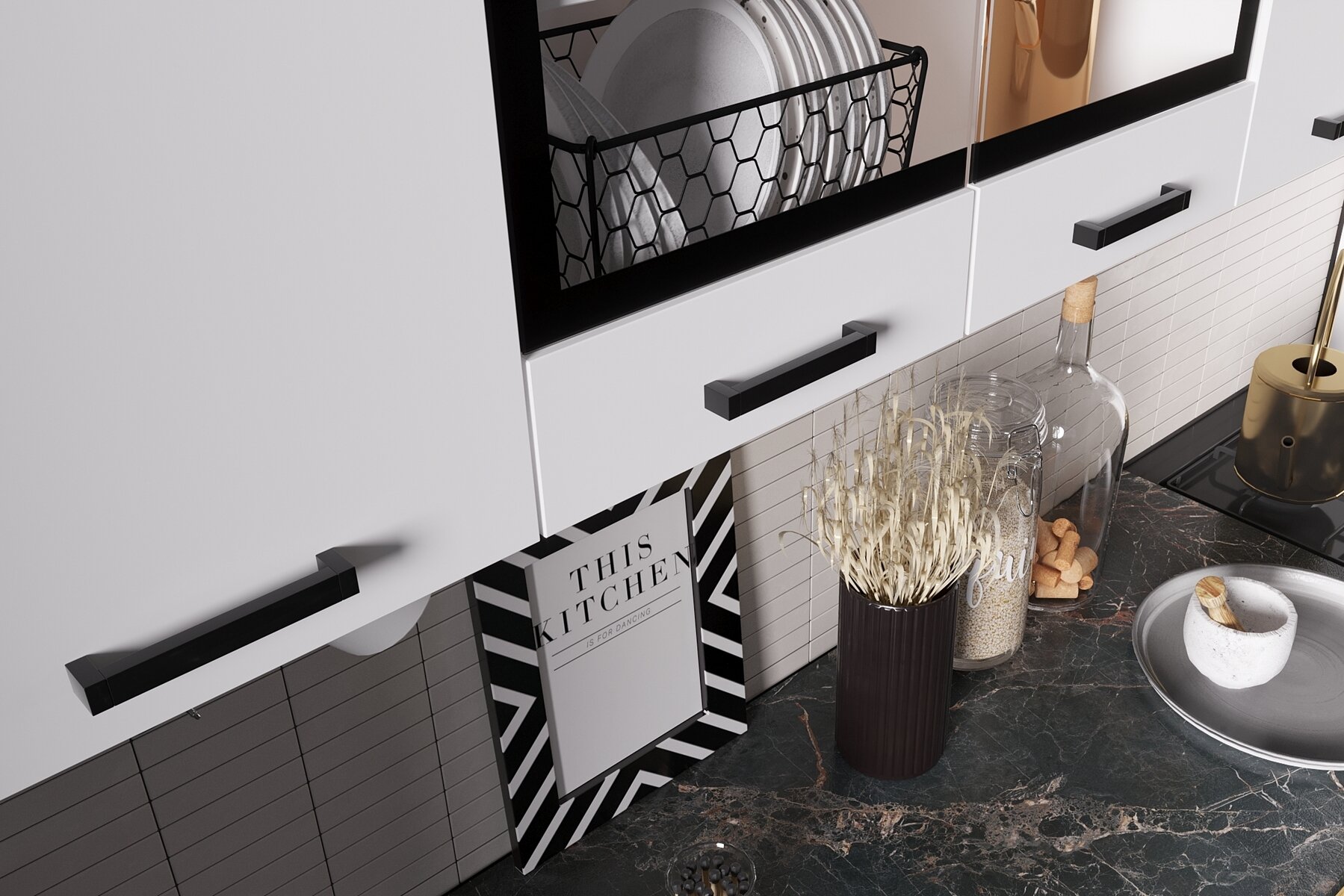 настенный шкаф с одной дверцей, настенный шкаф со стеклянными вставками, настенный шкаф с двумя дверцами, шкаф напольный с ящиками и дверцами, шкаф напольный под мойку