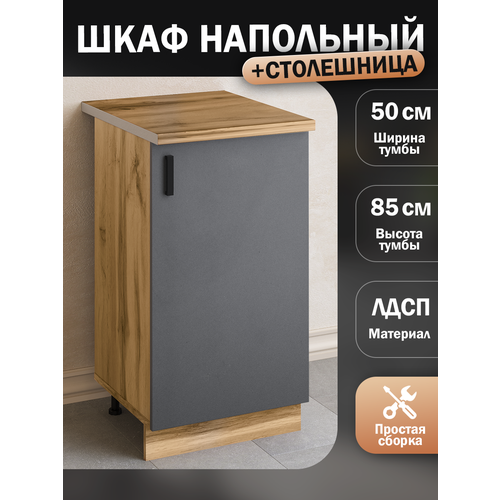 Стол тумба кухонный 50 со столешницей. Кухонный модуль напольный подойдет для обустройства кухни дома, на даче, в небольшой квартире, а также на летней кухне. Шкаф напольный для кухни разнообразен своим функционалом. Стол разделочный может быть использован как тумба под раковину, как сервировочный стол. В наличие представлены как напольные модули, так и навесные шкафчики. Вы с легкостью можете собрать свою модульную кухню и смоделировать кухонный гарнитур исходя из индивидуальных потребностей, подобрав кухонные модули нужных размеров для вашей кухни. Преимущества мебели:- Кромка ПВХ;- Глубина тумб - 439 мм, что позволяет устанавливать изделия не вплотную к стене, оставляя место для канализационных труб;- Цоколь позволяет избегать контакты тумбы с поверхностью пола;- Регулируемые ножки. Столешница глубиной 600 мм, высотой 28 мм (что совпадает с высотой накладной мойки)