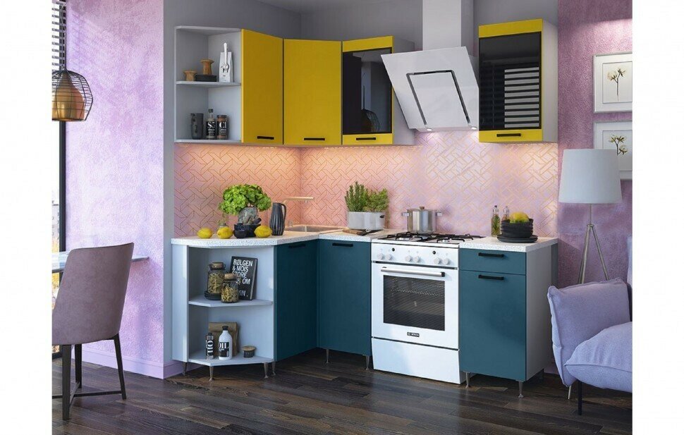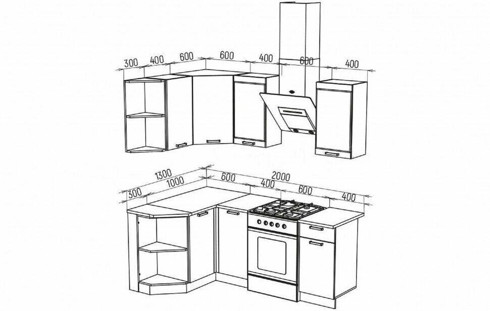 Верхние модули (ШхВхГ): ШВТ 300 - 28 х 71.8 х 28 см - 1 шт. ШВ 400 - 40 х 71.8 х 30 см - 2 шт. ШВС 400 - 40 х 71.8 х 30 см - 1 шт. ШВУ 600 - 60 х 71.8 х 60 см - 1 шт. Нижние модули (ШхВхГ): ШНТ 300 - 28 х 85 х 42.5 см - 1 шт. ШНУ 1000 - 100 х 85 х 44.5 см - 1 шт. ШН 400 - 40 х 85 х 44.5 см - 1 шт. ШН1Я 400 - 40 х 85 х 44.5 см - 1 шт. Столешница 30 см радиус (левый) - 1 шт. Столешница 40 см - 2 шт. Столешница 100 см - 1 шт.