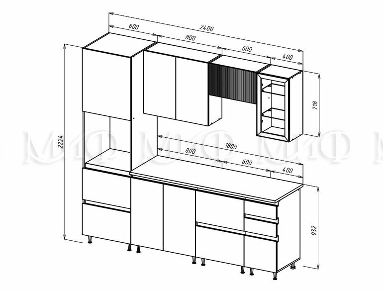 Верхние модули (ШхВхГ): ШВТ 300 - 28 х 71.8 х 28 см - 1 шт. ШВ 300 - 30 х 71.8 х 30 см - 1 шт. ШВГС 600 - 60 х 71.8 х 30 см - 2 шт. ШВУП 600 - 60 х 71.8 х 30 см - 1 шт. Нижние модули (ШхВхГ): ШНТ 300 - 28 х 85 х 42.5 см - 1 шт. ШНУ 900 - 90 х 85 х 44.5 см - 1 шт. ШН 600 - 60 х 85 х 44.5 см - 1 шт. ШН1Я 600 - 60 х 85 х 44.5 см - 1 шт. ШНВТ 600 - 60 х 85 х 44.5 см - 1 шт. Столешница 30 см радиус (правый) - 1 шт. Столешница 60 см - 3 шт. Столешница 90 см - 1 шт.