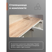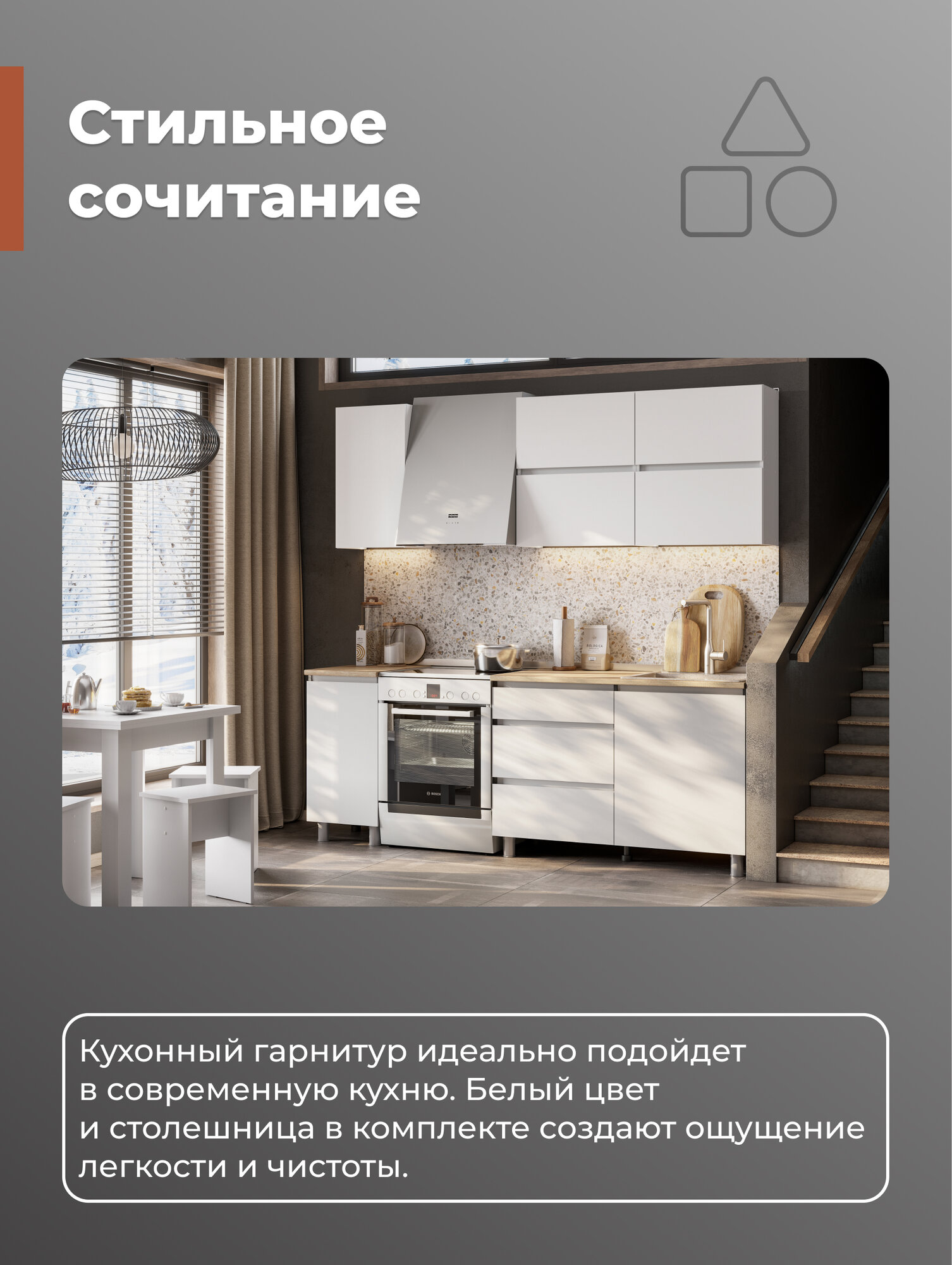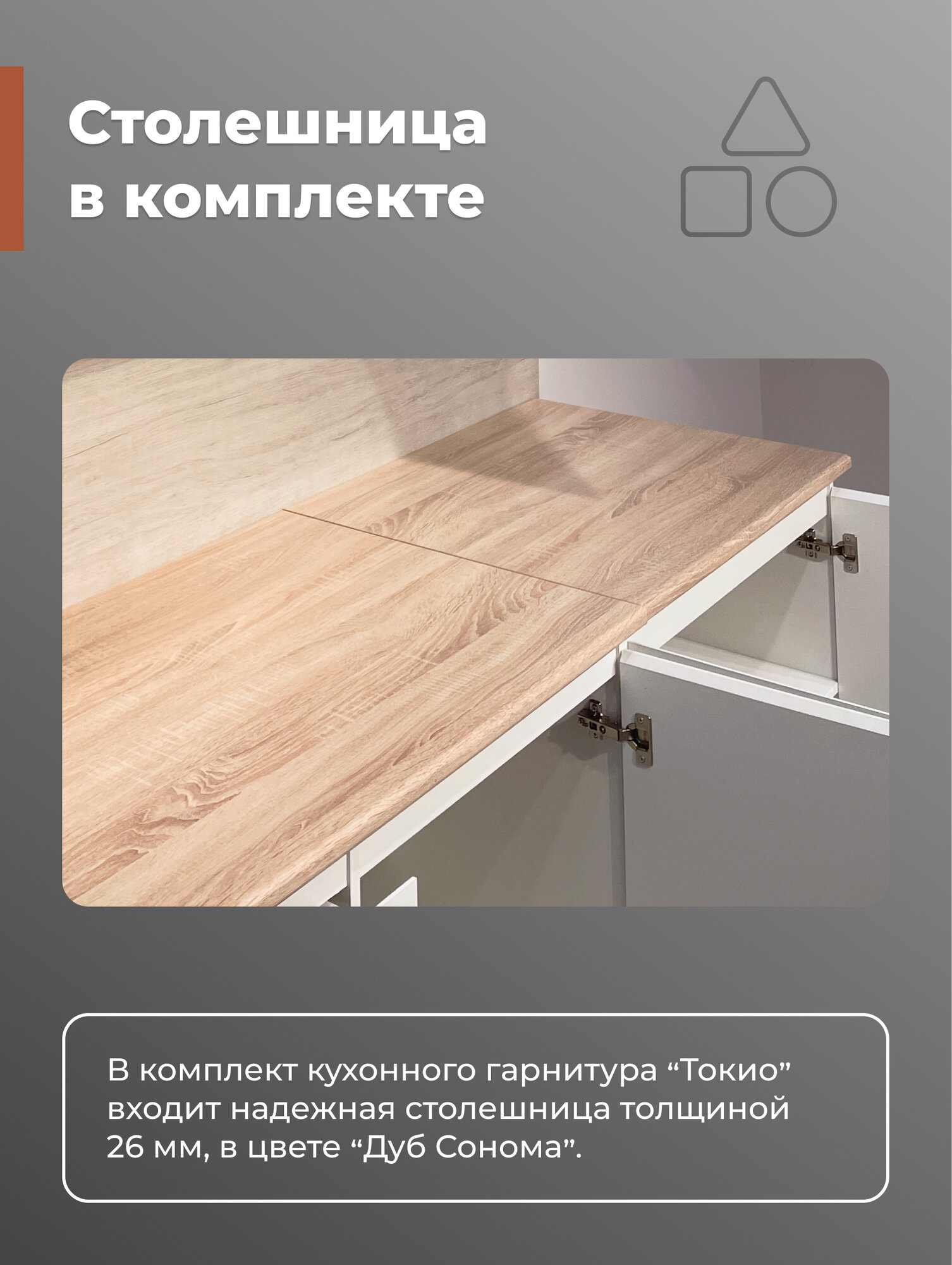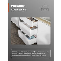Кухонный гарнитур Токио 1.6 метра — готовое решение для создания светлого и визуально легкого интерьера. Дверцы ящиков и шкафов не имеют лицевой фурнитуры и открываются захватом рукой за тыльный край фасада, что смотрится современно и упрощает уход за поверхностью. Столешница в оттенке натурального дерева делает гарнитур уютнее, а регулируемые опоры помогают справиться с небольшими неровностями пола.