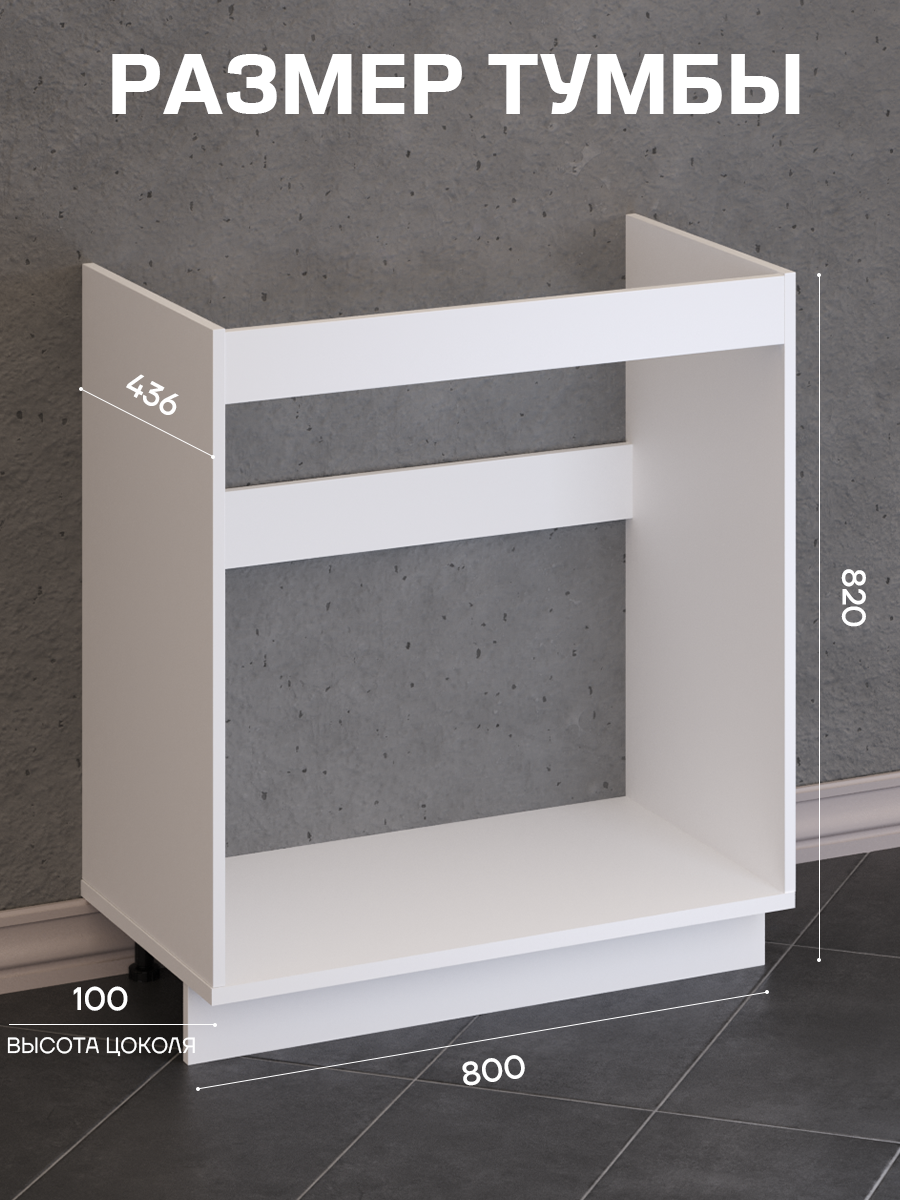 Тумба под мойку шириной 80 см для кухни. Цвет белый. Тумба под раковину на кухню с нержавеющей мойкой - идеальный комплект для Вашей кухни. Модульная мебель из высококачественной ЛДСП - это практичный и экономный выбор для кухонь. Тумба под раковину на кухню - это идеальное решение для вашей кухни. Изготовленная из высококачественной ЛДСП, она сочетает в себе практичность и стиль. Нижняя полка позволяет разместить мусорное ведро или моющие средства, делая этот шкаф многофункциональным - он может служить как шкаф для хранения, шкаф под умывальник или кухонный шкаф. Глубина тумб 436 мм (что позволяет устанавливать тумбу не вплотную к стене, оставляя место для канализационных труб). Цоколь (позволяет избегать контакта тумбы с поверхностью пола). Регулируемые ножки. Комплектация: фурнитура для сборки, инструкция по сборке, крепеж для мойки (мойка в комплект не входит). Наша мебель для кухни имеет стильный и привлекательный дизайн, который гармонично впишется в любой интерьер в стиле лофт и минимализм, скандинавский и классический стиль. Все изделия также изготавливаются из экологически чистых материалов, что создаёт безопасную и уютную атмосферу на вашей кухне. Наша тумба под раковину - это идеальное решение для вашей кухни. Почему она так хороша: