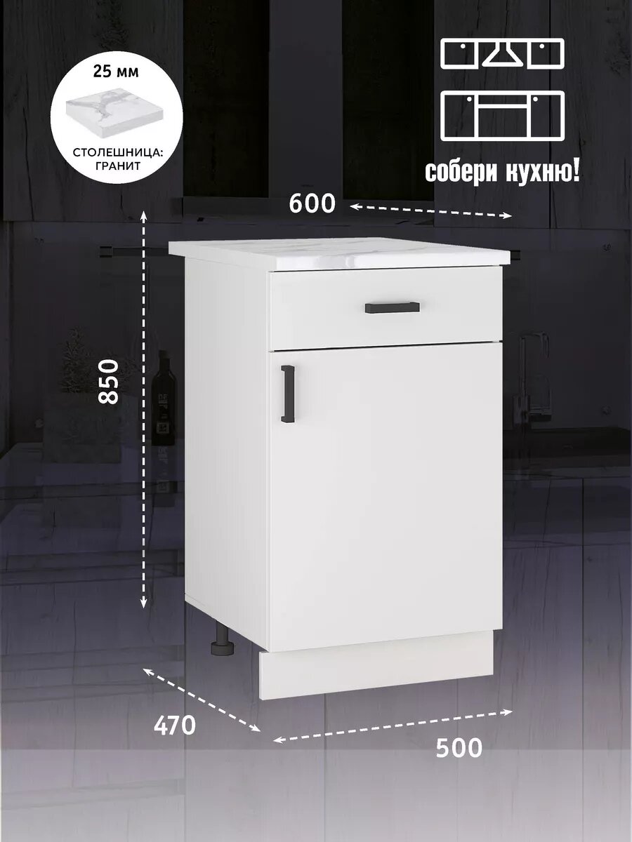 Представляем вашему вниманию кухонный напольный шкаф шириной 60 см из серии модульных гарнитуров “Аврора” - идеальное решение для вашей кухни! Этот модуль оснащен выдвижным ящиком с роликовыми направляющими и полкой, что обеспечивает удобное хранение ваших кухонных принадлежностей. Тумба изготовлена из прочной и экологически безопасной ЛДСП класса Е1. Современный стиль минимализма и элегантный белый цвет делают её универсальной для любого интерьера. В дополнение к этому, регулируемые ножки (+3 см) позволяют адаптировать высоту шкафа под ваши нужды. Полный набор качественной фурнитуры поможет вам без труда справиться со сборкой и монтажом изделия. Столешница “Скиф” цвета «Гранит» входит в комплект, она выполнена из износостойких материалов, что обеспечивает ей прочность и долговечность. Эта столешница легко моется, устойчива к царапинам и высоким температурам, сохраняя свой первозданный вид на протяжении многих лет. Модульная система кухонных гарнитуров “Аврора” позволяет вам создать кухню своей мечты, комбинируя различные элементы. Выбирайте из широкого ассортимента модулей, чтобы создать кухню, идеально подходящую для вашего дома и образа жизни. Не упустите возможность обновить свою кухню с помощью модульного гарнитура “Аврора”! Сделайте её более функциональной и стильной уже сегодня!