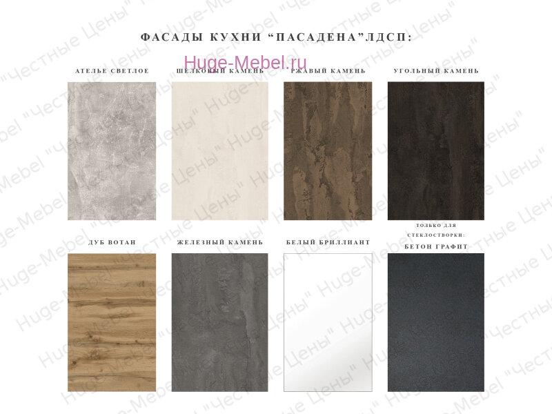 Палитра каменных декоров кухни «Пасаденна», от светлого бетона до насыщенно-угольного, представляет возможность подобрать наиболее оптимальный и подходящий оттенок для Вашего интерьера. Благодаря естественной текстуре фасадов и массивными ручками создается особая природная атмосфера. Кухня отлично впишется в лофт и скандинавский стиль с преобладанием древесных декоров