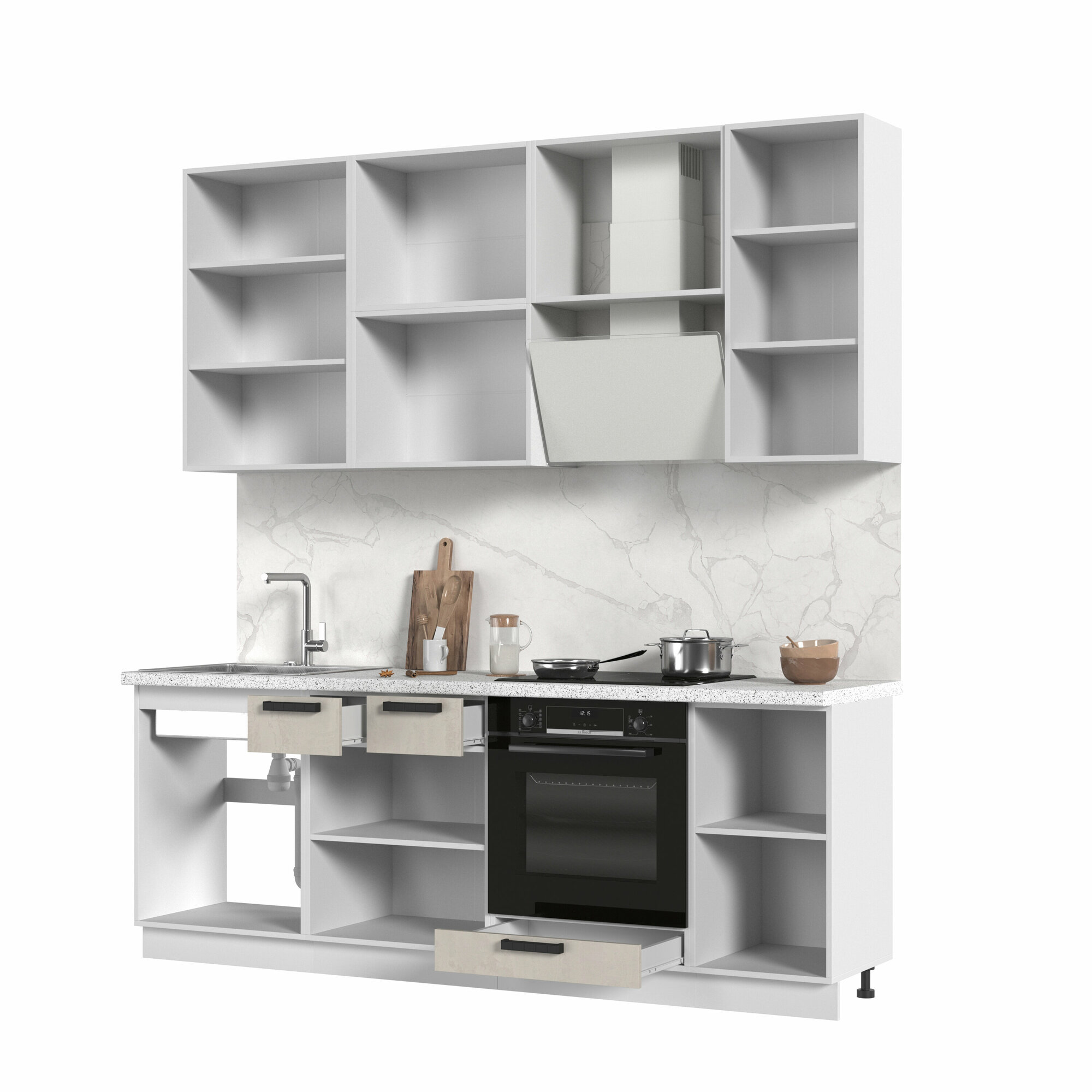 Купить Кухонный гарнитур высокий, без столешницы, Кухня Пасаденна 220 см, h=2370мм, Белый / Шелковый камень с доставкой по всей России.