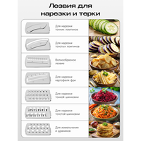 Комплектация: основание кухонного комбайна с чашей, диск эмульгатор, нож для измельчения, нож для теста, пластиковая пластина для лезвий, набор лезвий для нарезки – 7 шт (волнообразное лезвие, для нарезки тонких ломтиков, для нарезки толстых ломтиков, для нарезки картофеля фри, для нарезки тонкой соломки, для нарезки толстой соломки, для измельчения), лопатка, руководство пользователя, подарочная коробка + транспортировочная коробка.