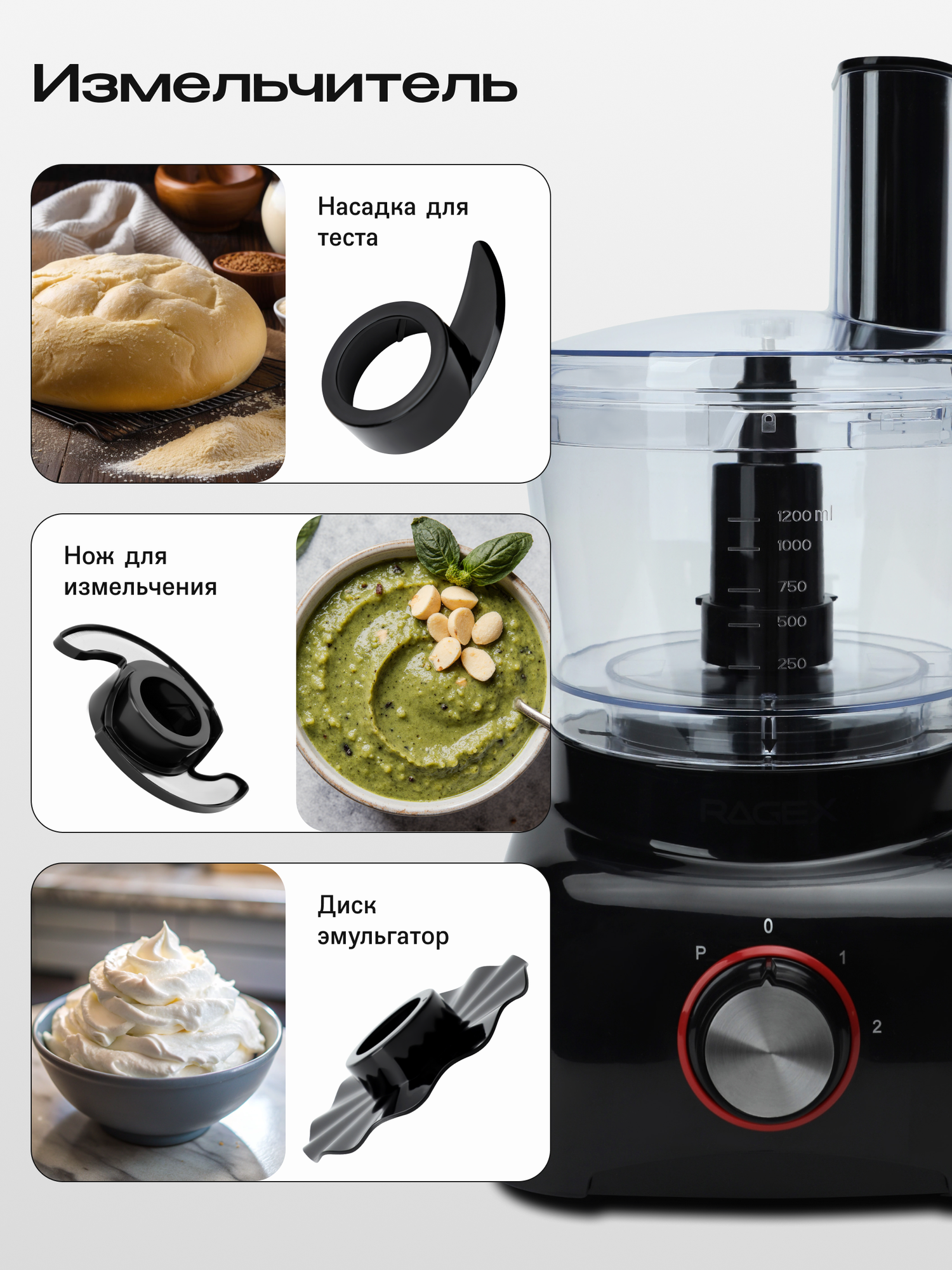 Кухонный комбайн RAGEX R113-000 - это компактное и многофункциональное устройство, которое подходит для выполнения различных задач на кухне. Он сочетает в себе функции измельчения, нарезки, взбивания и других операций, что делает его удобным для приготовления небольших порций блюд.