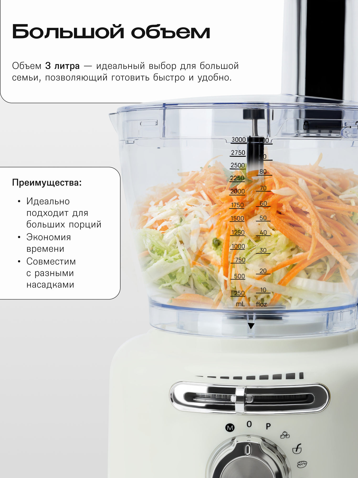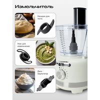 Комплектация: основание кухонного комбайна с чашей; блендер с крышкой; диск эмульгатор; нож для измельчения; нож для теста; лопатка; диск – 4 шт (лезвие для нарезки картофеля фри; двухстороннее лезвие для крупной шинковки – диск-жюльен; двухстороннее лезвие для мелкой шинковки – диск-жюльен; терка для драников); соковыжималка; кофемолка. Дополнительно: руководство пользователя; подарочная коробка + транспортировочная коробка.