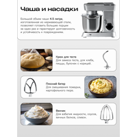 - Объем чаши: 4.5 л. Вместительная чаша подходит для приготовления больших порций. Объем блендера: 1,5 л.