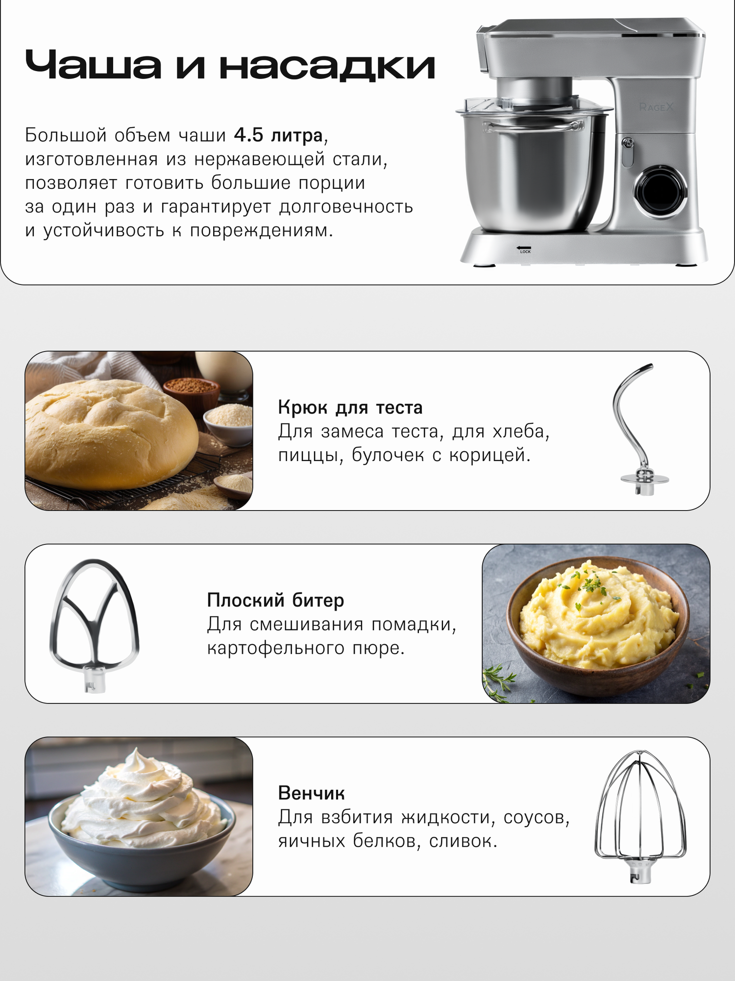 Кухонный комбайн RAGEX R112-900 — это мощное и многофункциональное устройство, которое станет незаменимым помощником на кухне. Он сочетает в себе функции мясорубки, блендера, миксера, овощерезки и других инструментов, что делает его идеальным для приготовления разнообразных блюд.