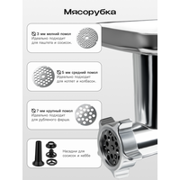 Комплектация: кухонный комбайн, чаша металлическая, защитная крышка от брызг, крюк для теста, венчик для взбивания, венчик для перемешивания, лопатка, блендер, мясорубка (корпус мясорубки, толкатель, лоток, шнек, нож, гайка зажимная, решетки с отверстиями, насадка для сосисок, насадка для колбасок «кеббе», разделитель для колбасок «кеббе»), овощерезка (корпус овощерезки, толкатель, мелкая терка, крупная терка, слайсер, терка для драников (мелкая)), руководство пользователя, подарочная коробка + транспортировочная коробка.