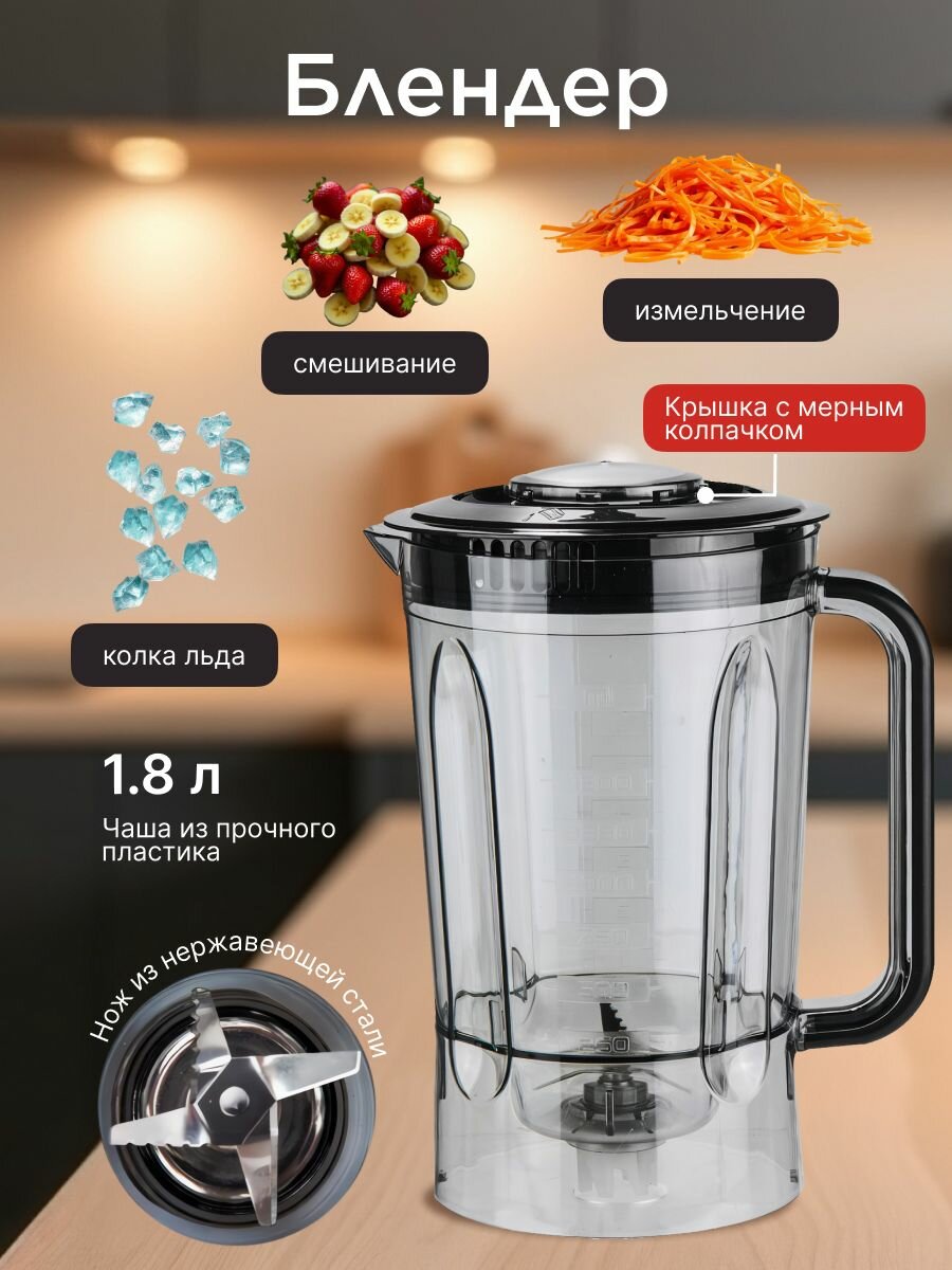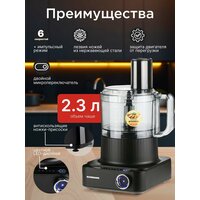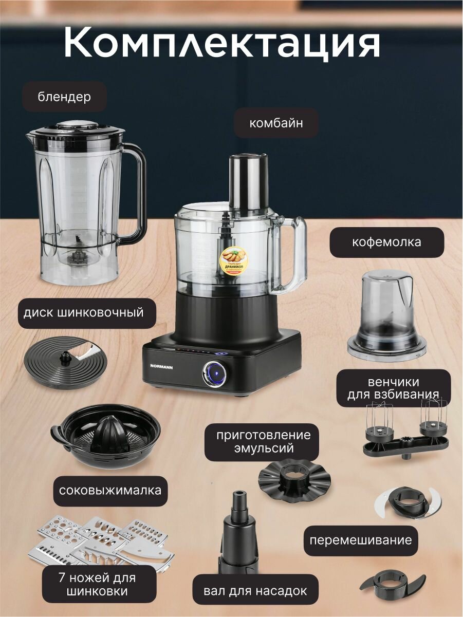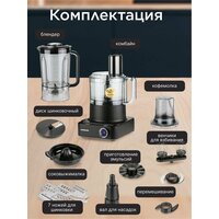 | Подробная комплектация | Комбайн; Чаша чоппера; Чаша блендера; Кофемолка; Соковыжималка; Насадка-венчики; Нож для комбайна - 7 шт.; Вращающийся диск; Насадка для приготовления эмульсий; Насадка для измельчения; Насадка для перемешивания; Руководство по эксплуатации; Предупреждающий вкладыш. |