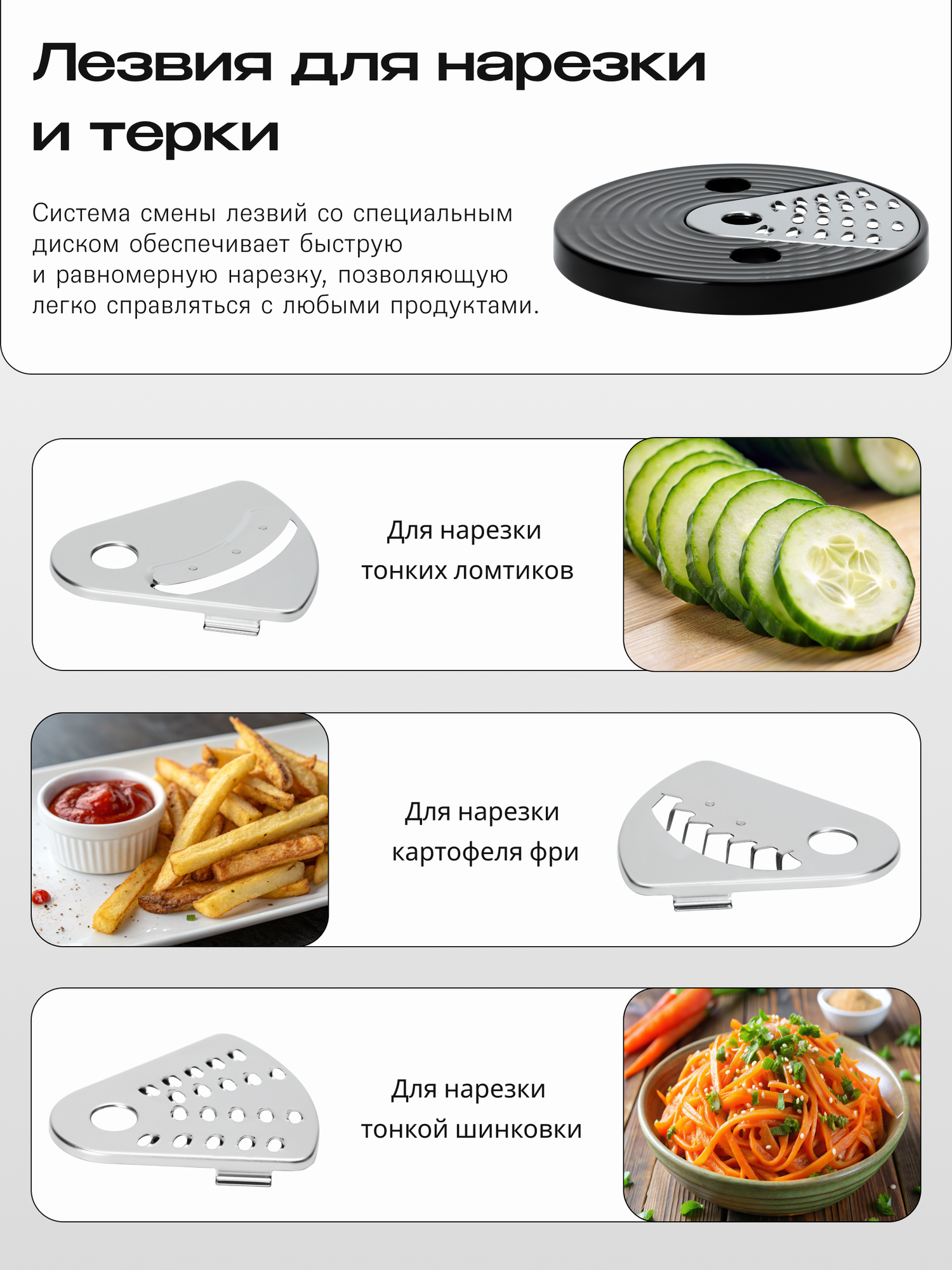 - Высокая мощность: обеспечивает быструю и эффективную обработку даже твердых продуктов .