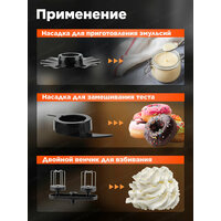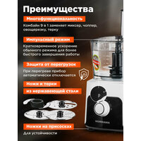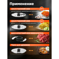 | Насадки | эмульсионная, насадка-терка, мельничка, для нарезки соломкой, венчик для взбивания, для нарезки ломтиками, для замешивания теста, универсальный нож |