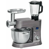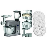 | Подробная комплектация | Чаша из стали 6,2 л для 3–3,5 кг теста Стеклянная чаша блендера 1,5 л Венчик для легкого теста и яичных белков Алюминиевый литой крюк для тяжелого теста Алюминиевый литой крюк для перемешивания Прозрачная крышка с отверстием для добавления продуктов Мясорубка: 3 решетки, насадка для колбас, насадка для печенья, насадки для макарон |