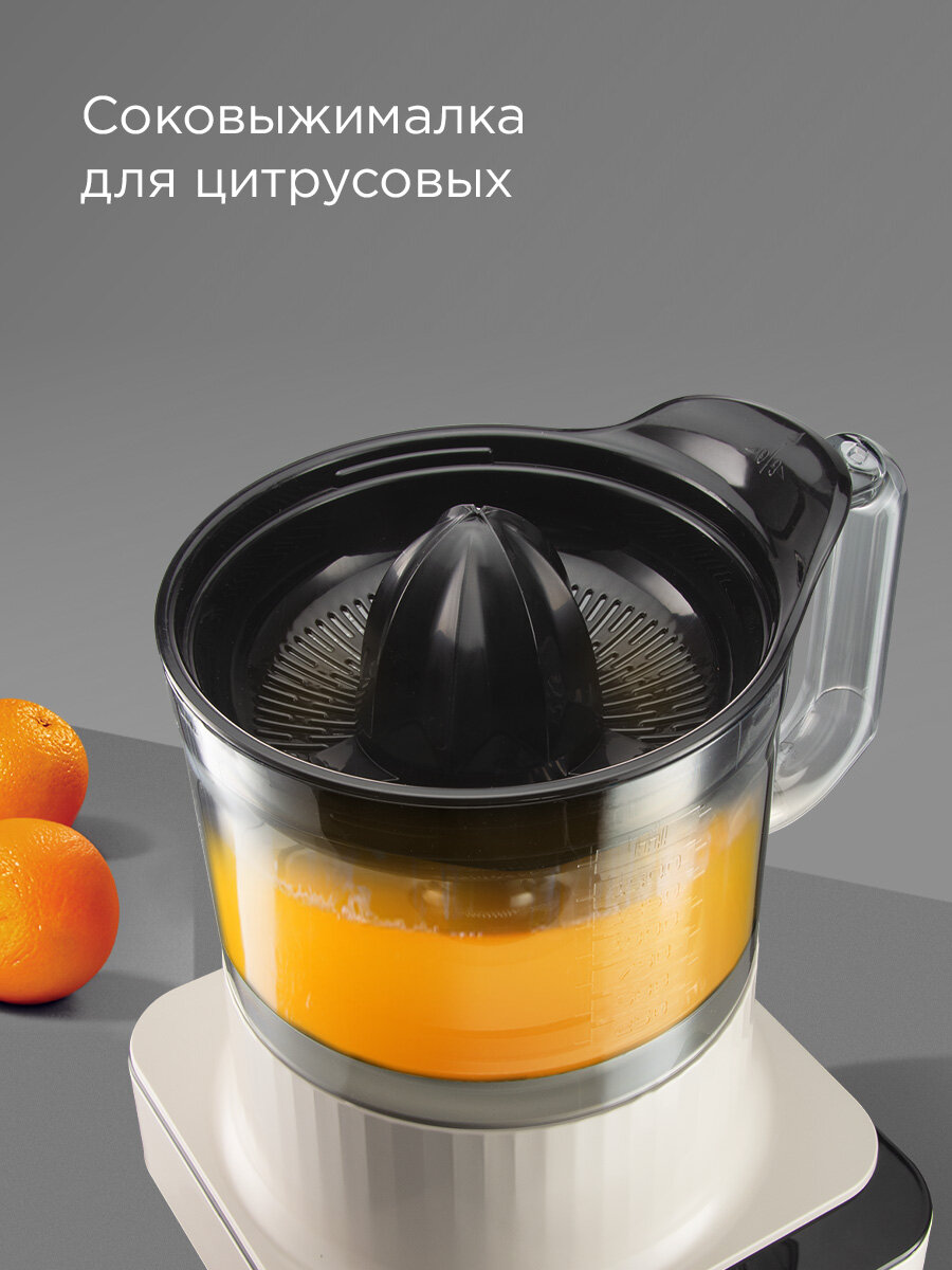 В комплекте есть ребристая соковыжималка для цитрусовых. Вам не придется прикладывать силу, чтобы выдавить сок из фруктов, — достаточно нарезать плоды и поднести к вращающемуся конусу. Так вы сможете каждый день радовать близких свежим соком из грейпфрутов.