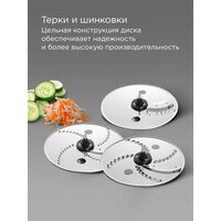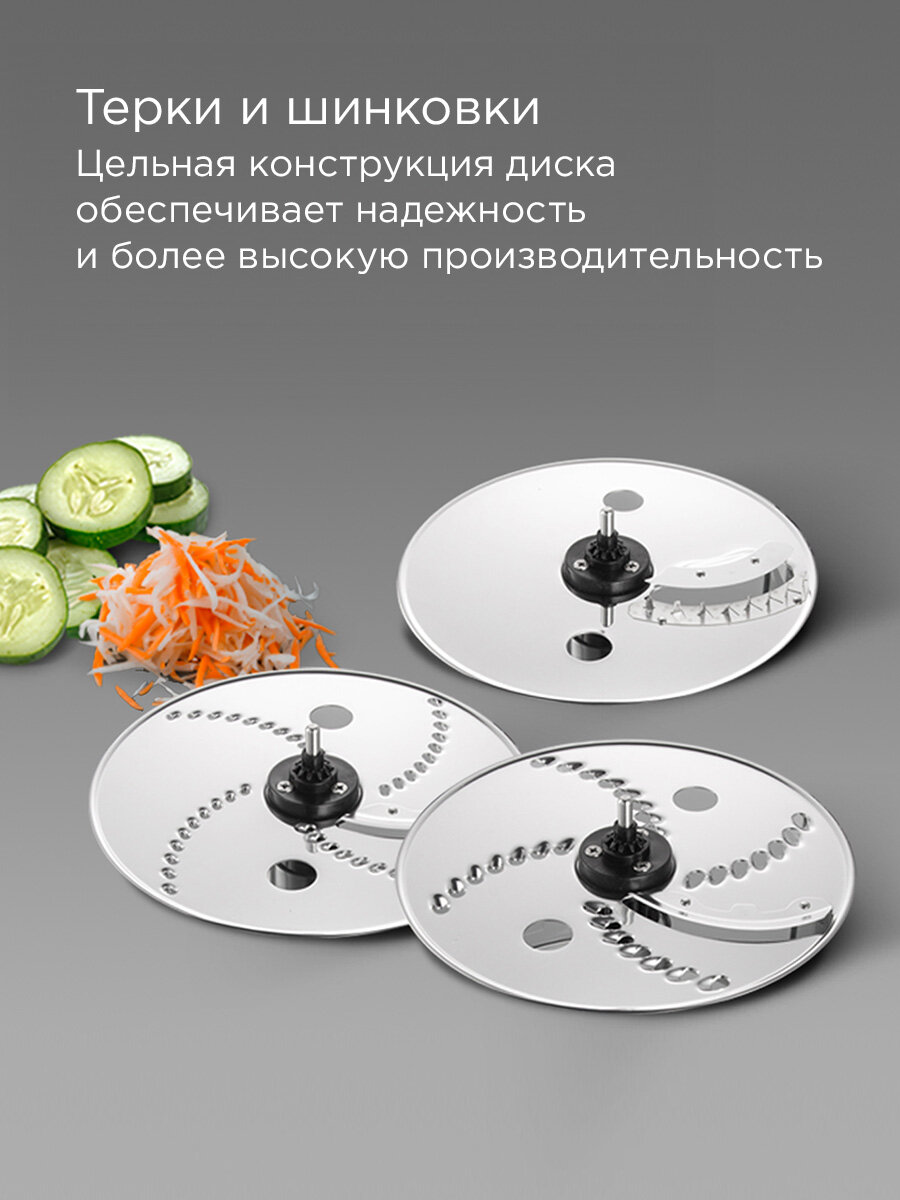 Максимальная мощность комбайна — 1300 Вт. Он легко обрабатывает жесткие овощи, нарежет твердый сыр и колбасы, измельчит орехи, кофейные зерна, специи и приправы. Вам не придется часто останавливаться, чтобы остудить комбайн.